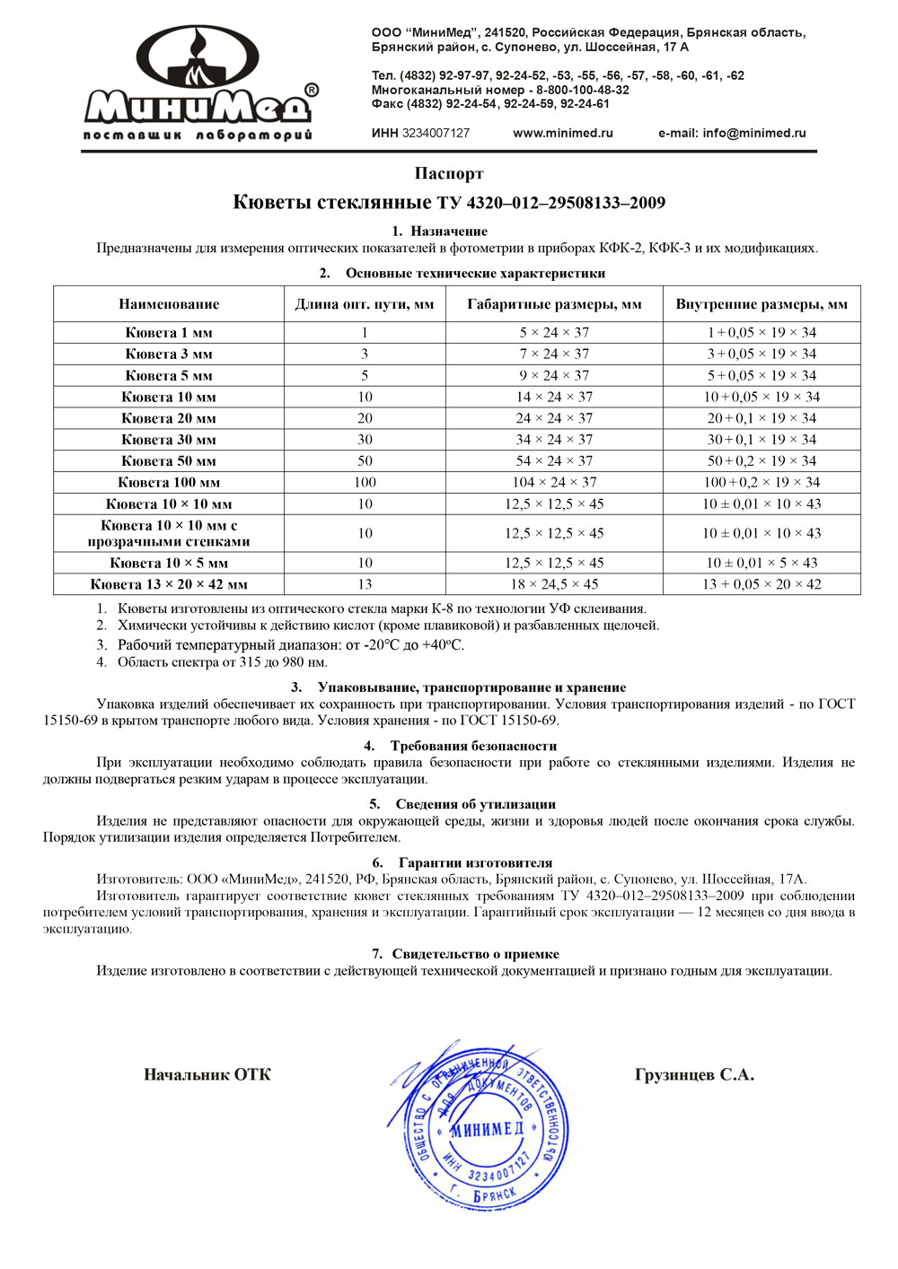 Кюветы для фотометрии изготовлены из оптического стекла марки К–8 по технологии УФ–склеивания. Химически устойчивы к действию кислот (кроме плавиковой кислоты) и разбавленных щелочей. Разработаны для приборов КФК–2, КФК–3 и их модификаций при работе в спектральном диапазоне от 315 до 980 нм.