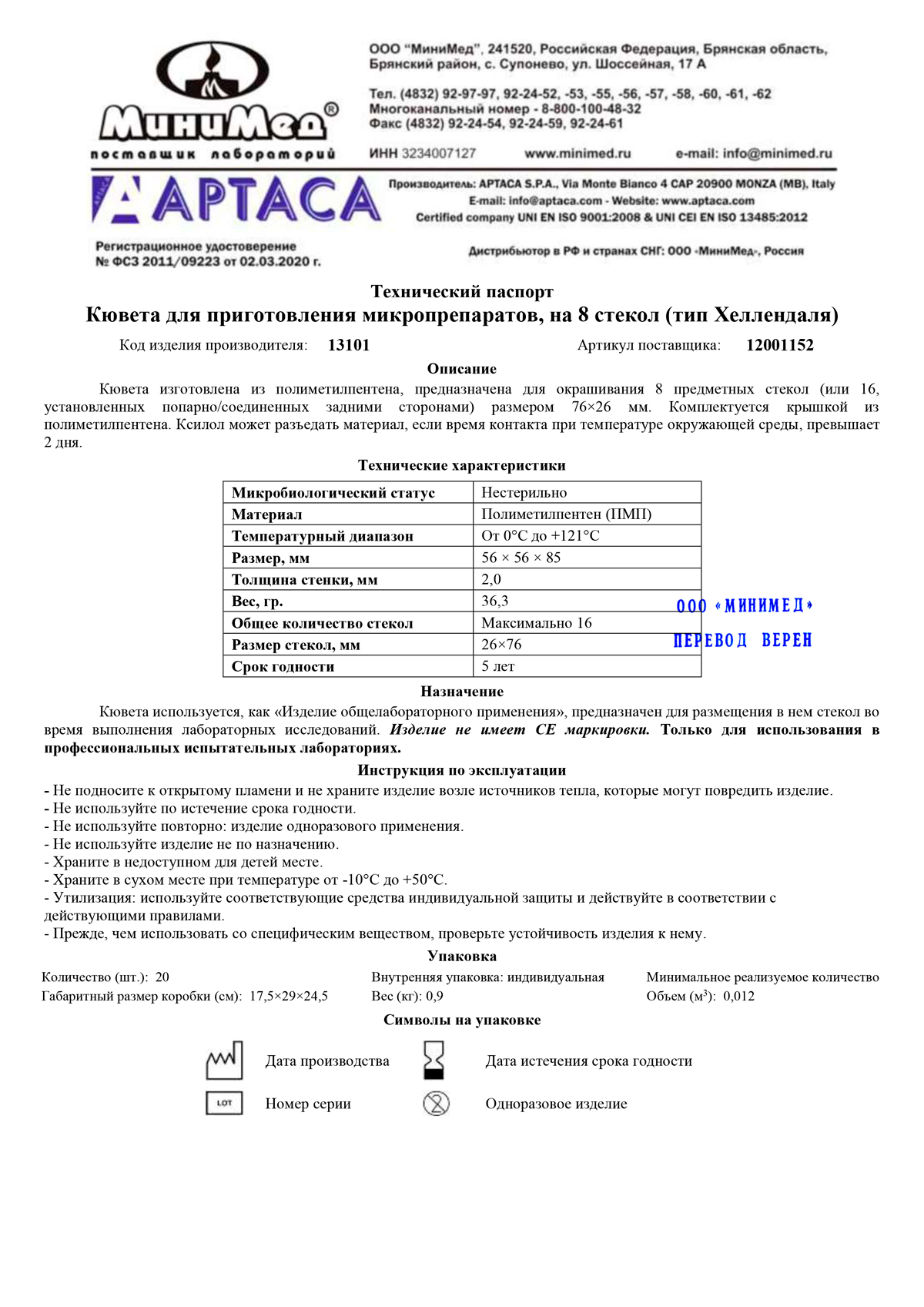 Кювета для приготовления микропрепаратов,на 8 стекол,тип Хеллендаля,56*56*85,ПМП,инд.уп., Aptaca