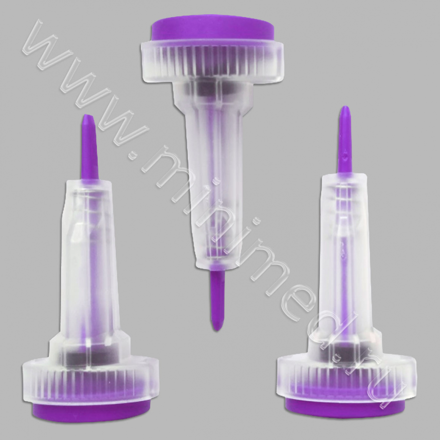 Ланцет заключен в пластиковый прозрачный чехол. Активация ланцета происходит при прикосновении к коже и нажатии на кнопку сверху ланцета. Цвет кнопки - сиреневый. Стерильность - гамма-лучи.