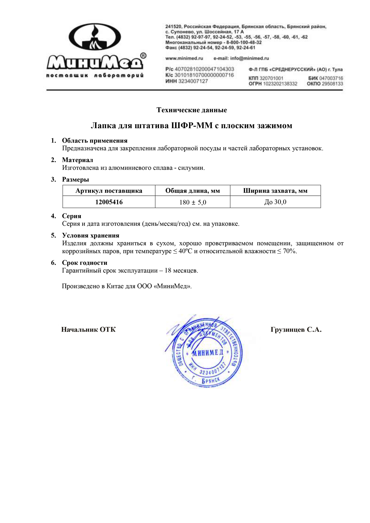 Лапка с плоским зажимом предназначена для закрепления лабораторной посуды и частей лабораторных установок.