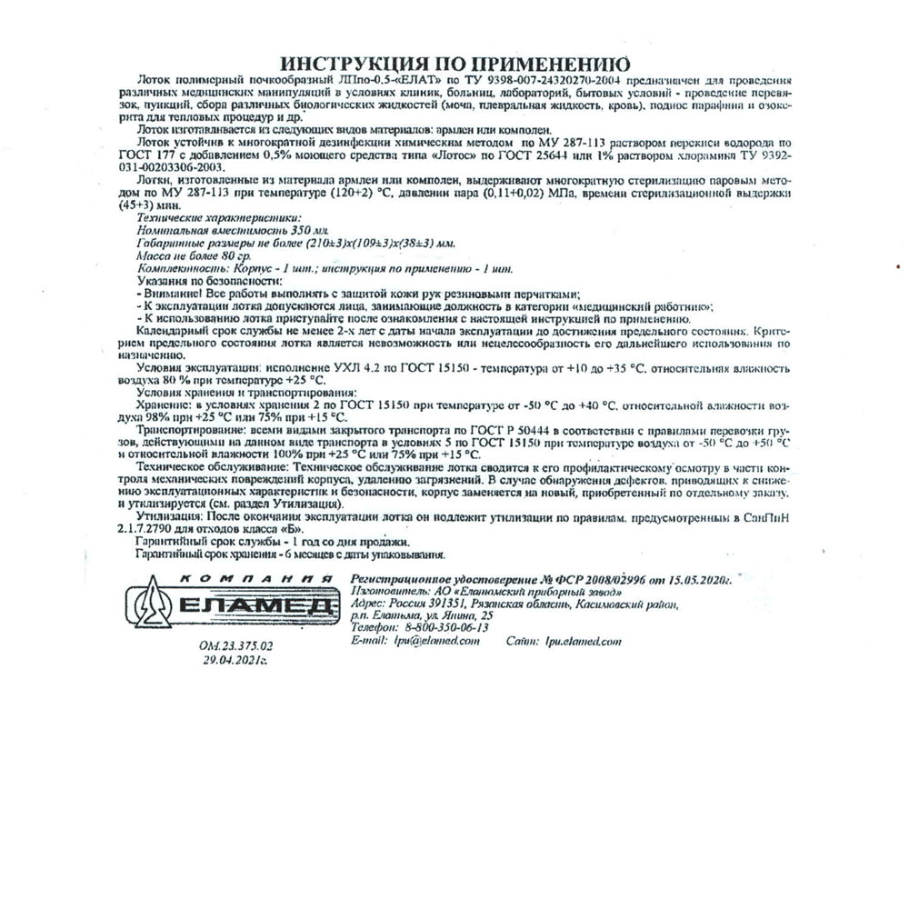 - Лоток полимерный почкообразный ЛПпо-0,5А - ЕЛАТ. Инструкция по применению.