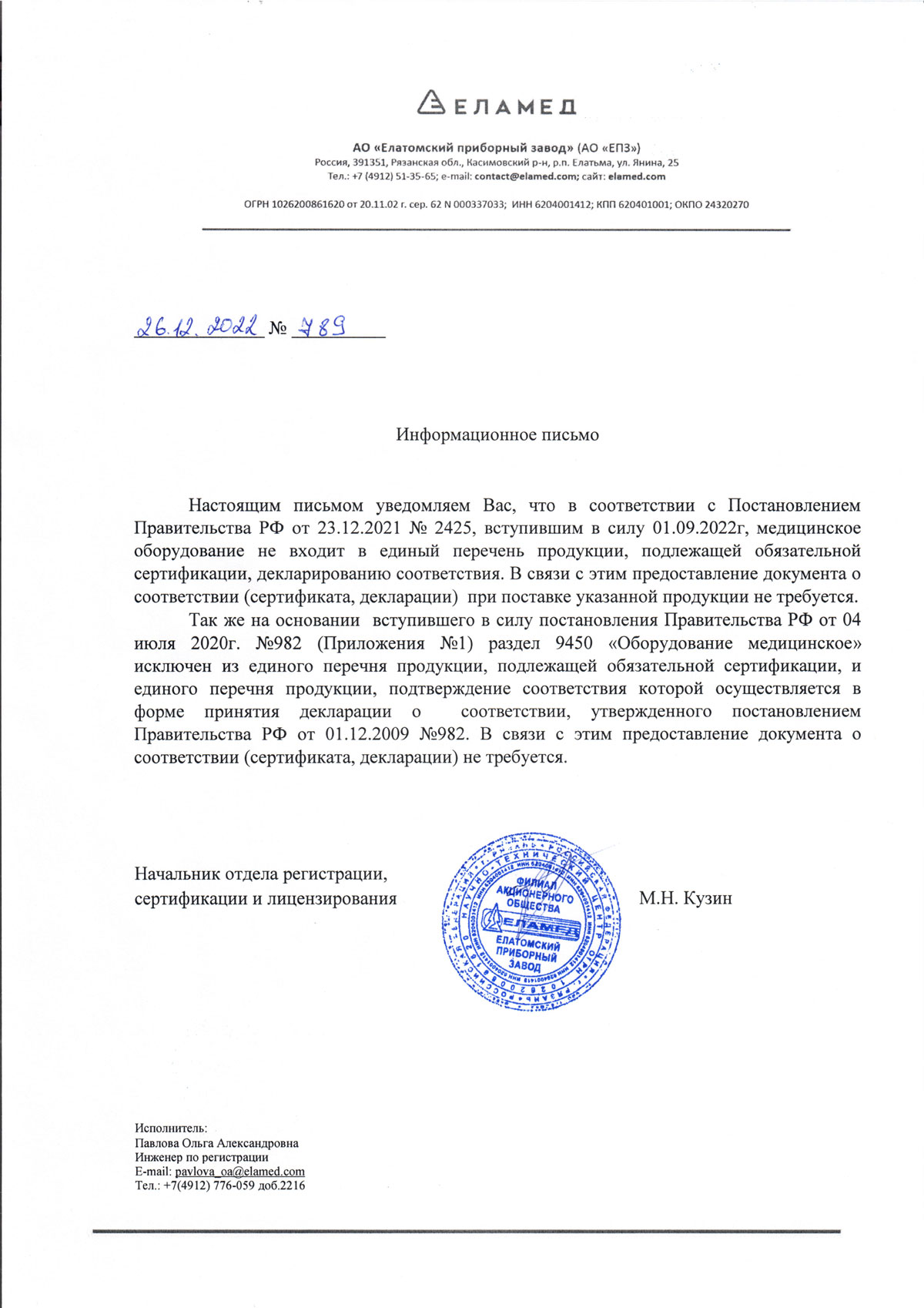 - АО ЕПЗ. Инф. письмо о декларации и сертификации от 789 от 26.12.2022