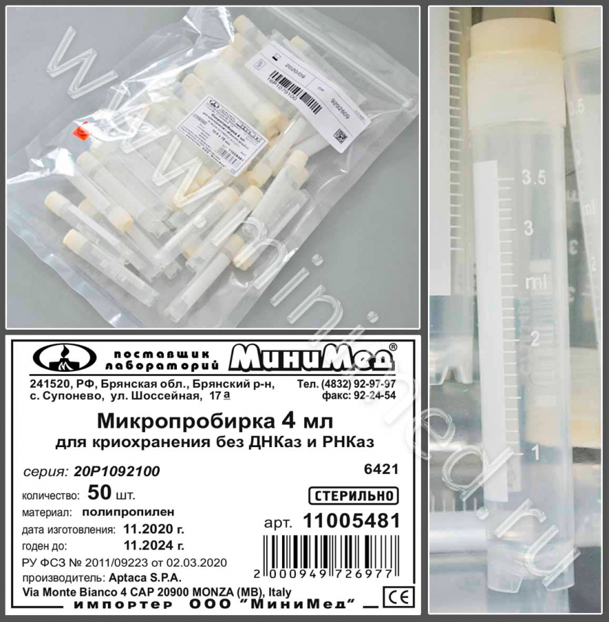 Микропробирка для криохранения 4 мл,с внеш.резьбой,диам.12,6*75,5 мм,стерильная,п/п, без ДНКаз и РНКаз, уп.50шт./1000 шт., Aptaca