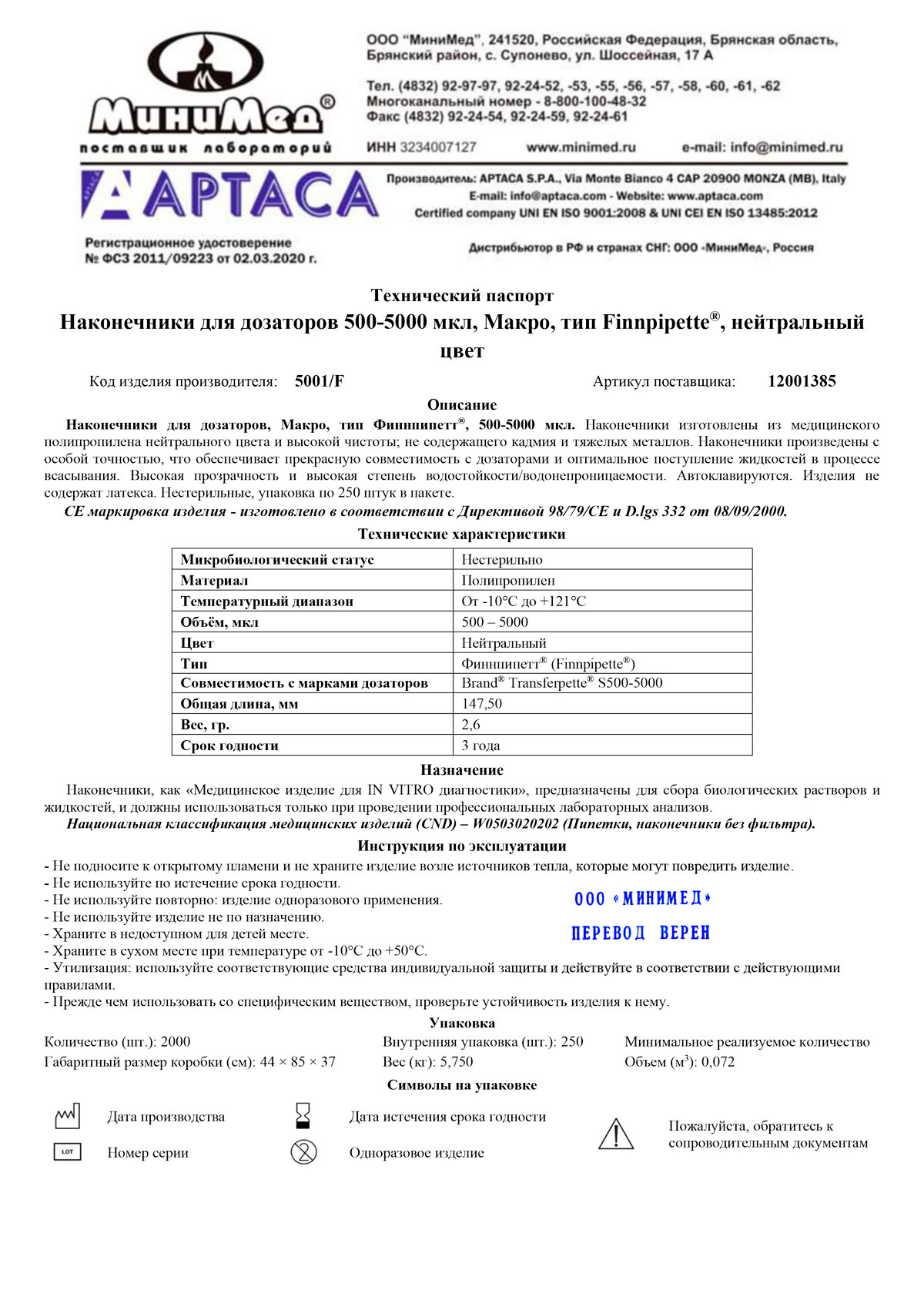 Наконечник для дозаторов 500-5000 мкл, Макро, тип Finnpipette, нейтральный, уп.250 шт, Aptaca