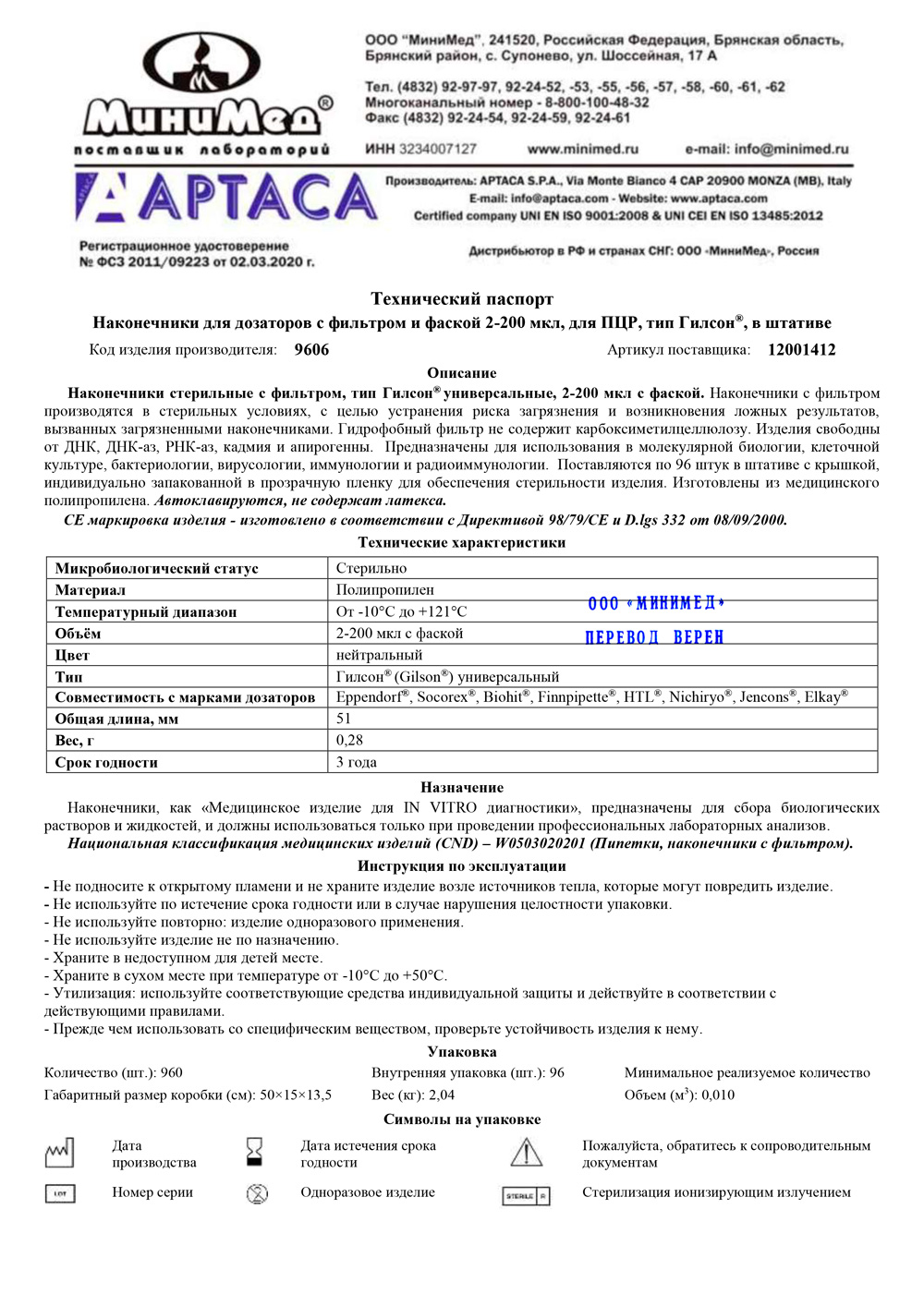 - Сертификат-9606-Наконечник для дозаторов с фильтром 2-200 мкл. Лот 5F0732S до 06