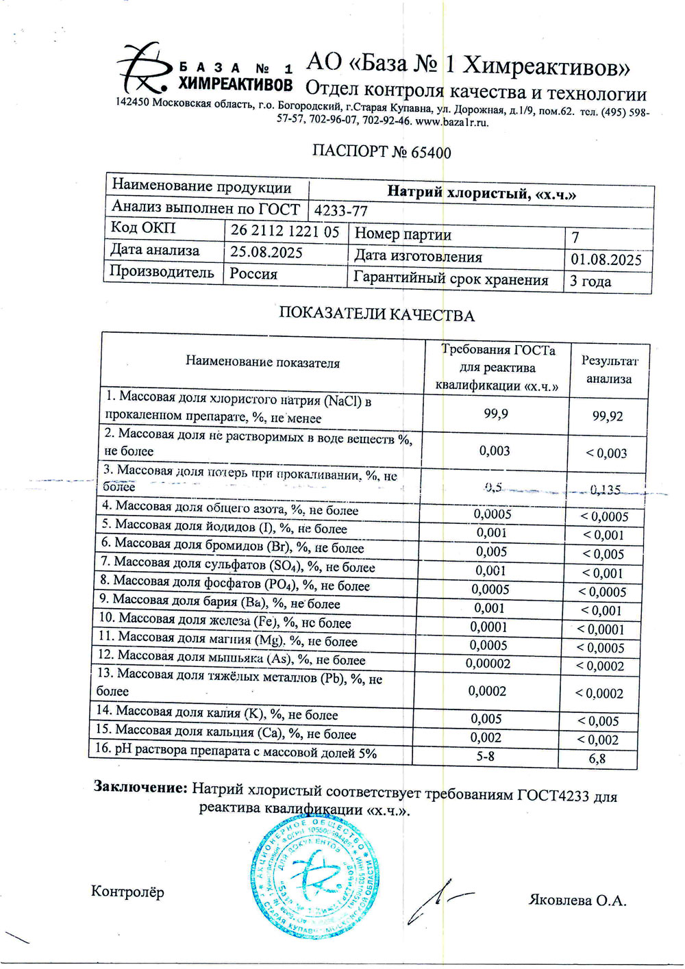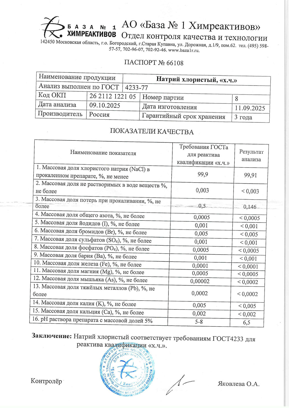 Натрий хлористый, хч, 1кг