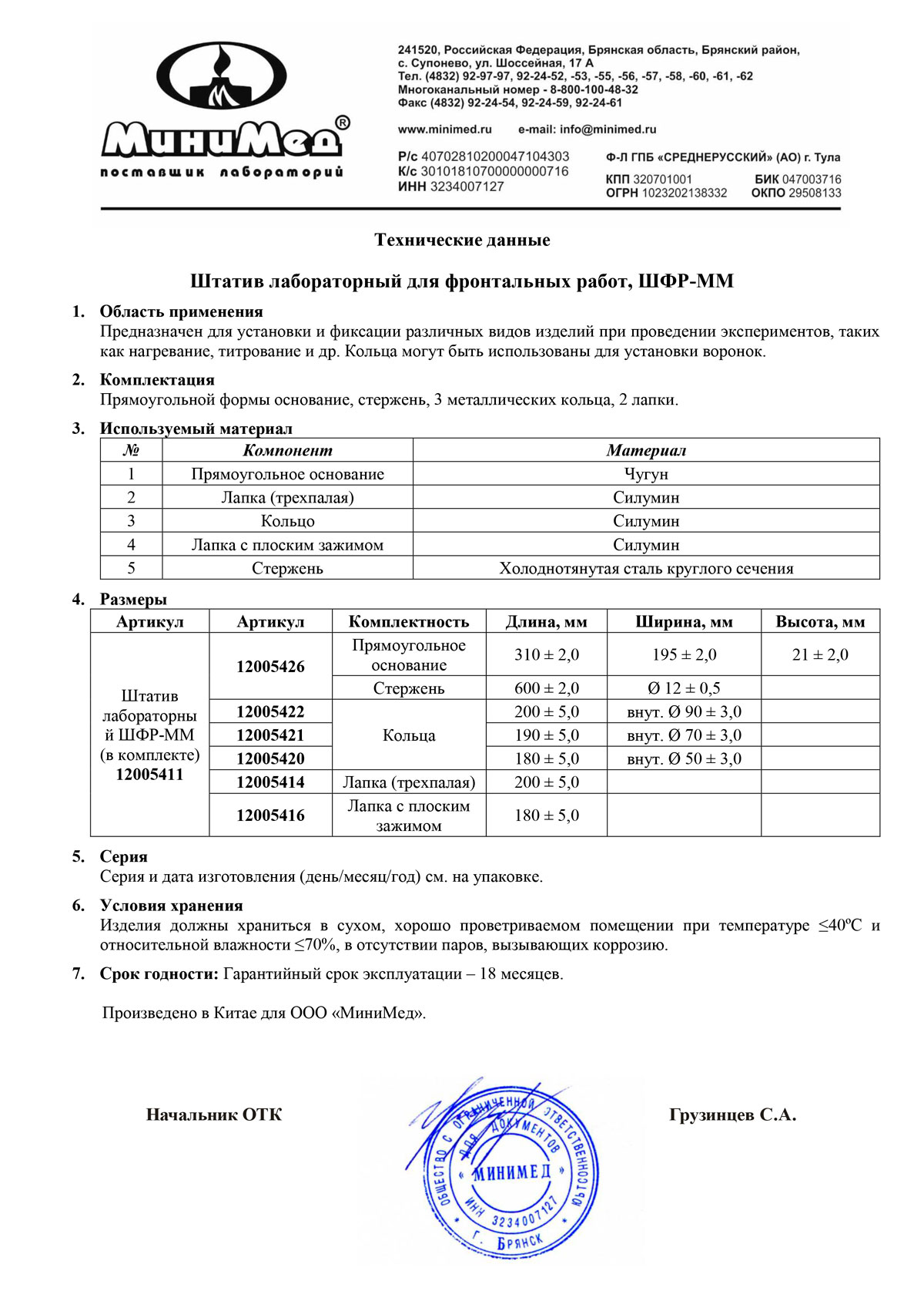 Высота стержня................................................. 600 ± 2,0 мм