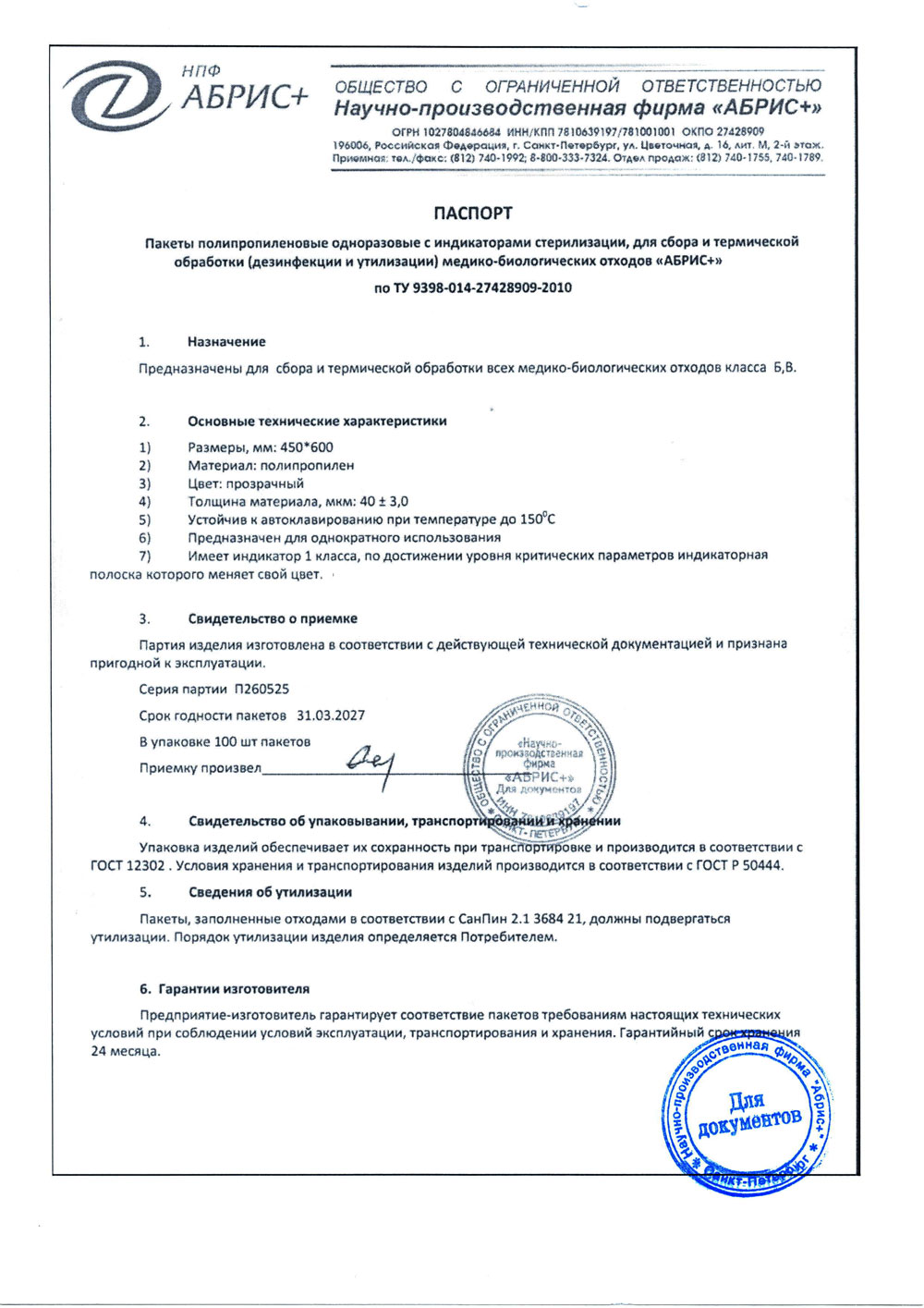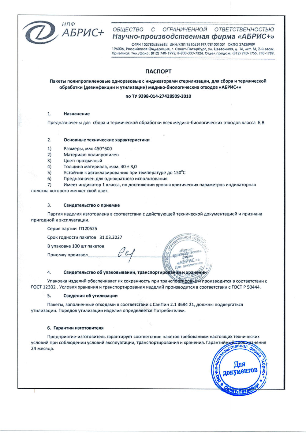 - Пакеты 450х600 полипропил. однораз. для отходов Абрис+. п. П120525 до 31.03.2027