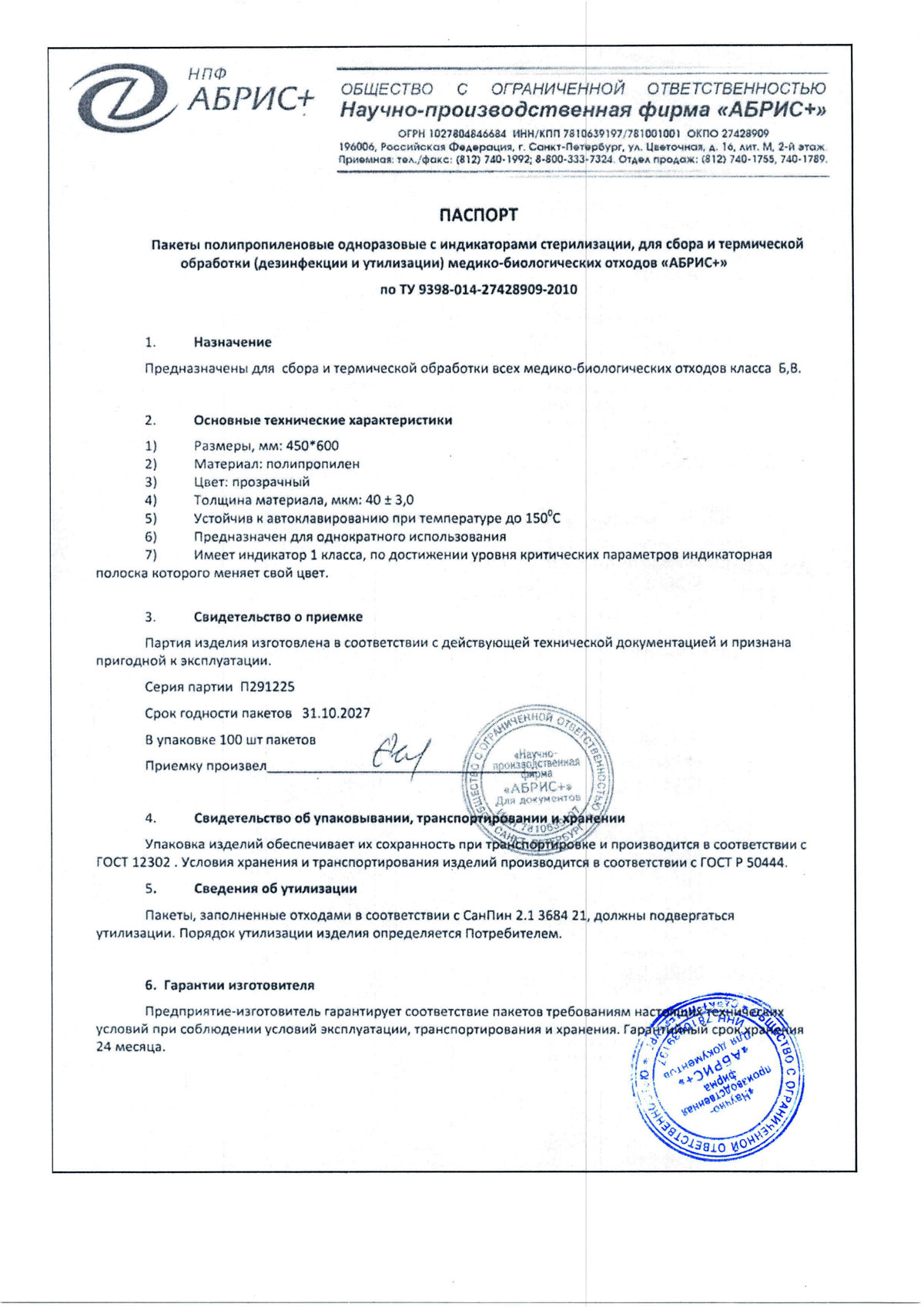 - Пакеты 450х600 полипропил. однораз. для отходов Абрис+. п. П291225 до 31.10.2027
