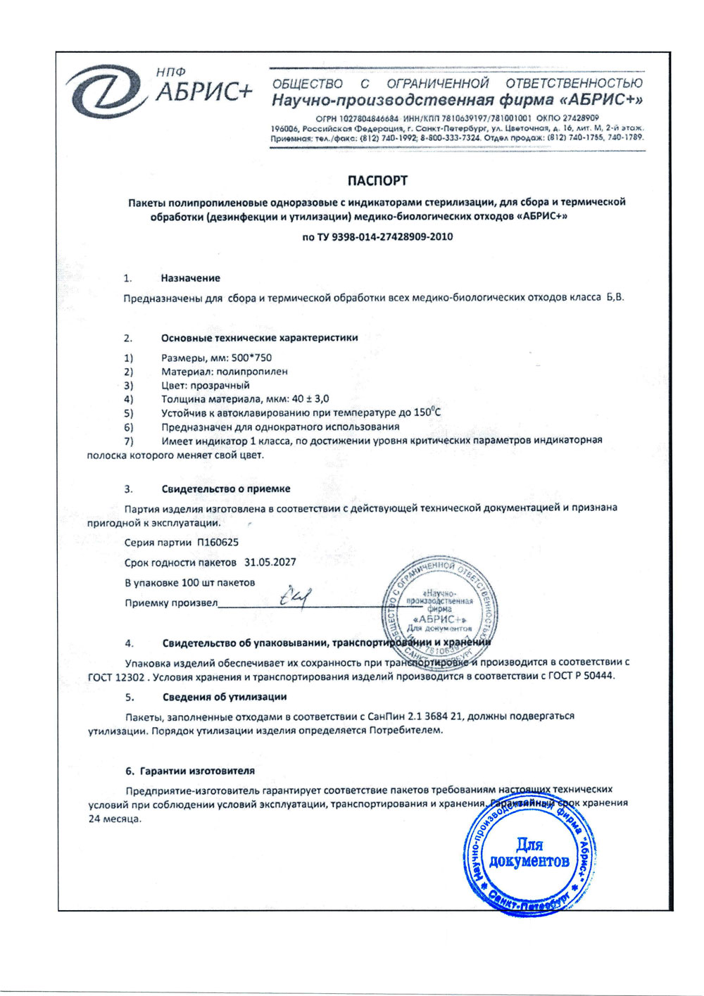- Пакеты 500х750 полипропил. однораз. для отходов Абрис+. п. П160625 до 31.05.2027