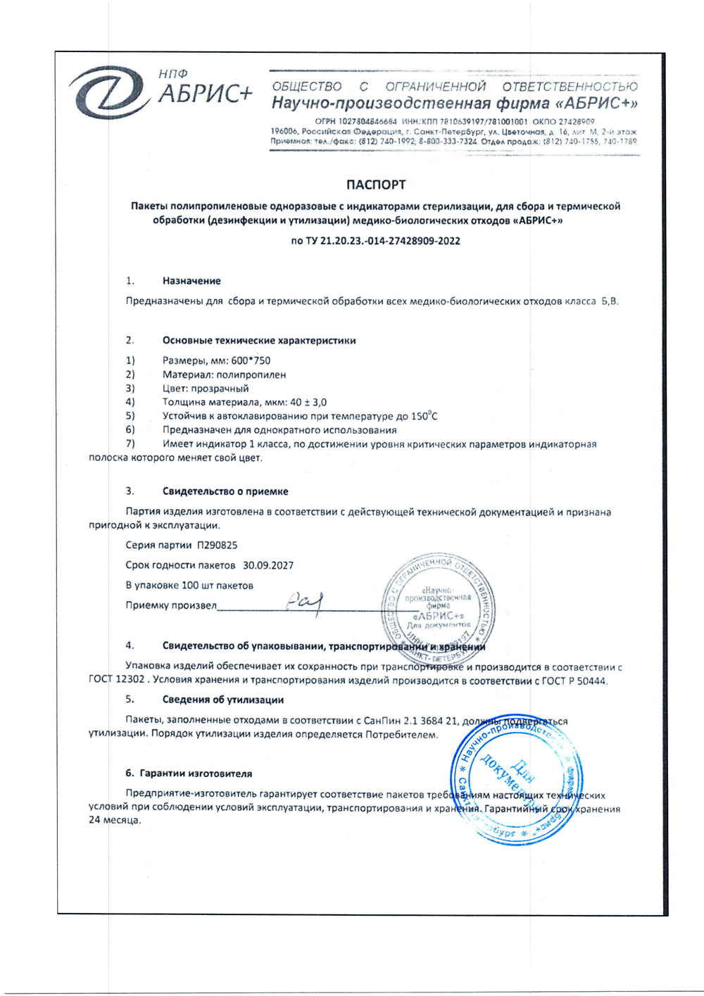 - Пакеты 600х750 полипропил. однораз. для отходов Абрис+. п. П290825 до 30.09.2027