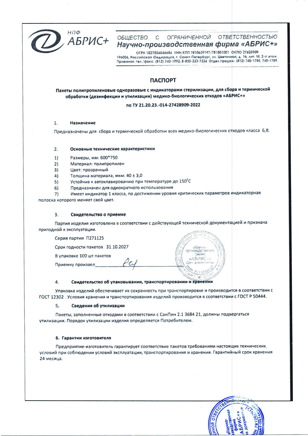 - Пакеты 600х750 полипропил. однораз. для отходов Абрис+. п. П271125 до 31.10.2027
