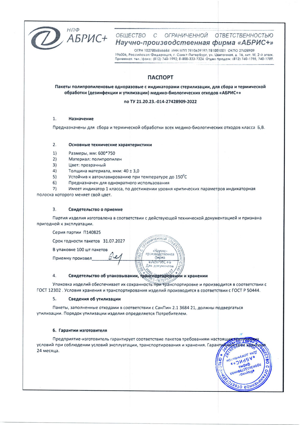 - Пакеты 600х750 полипропил. однораз. для отходов Абрис+. п. П140825 до 31.07.2027