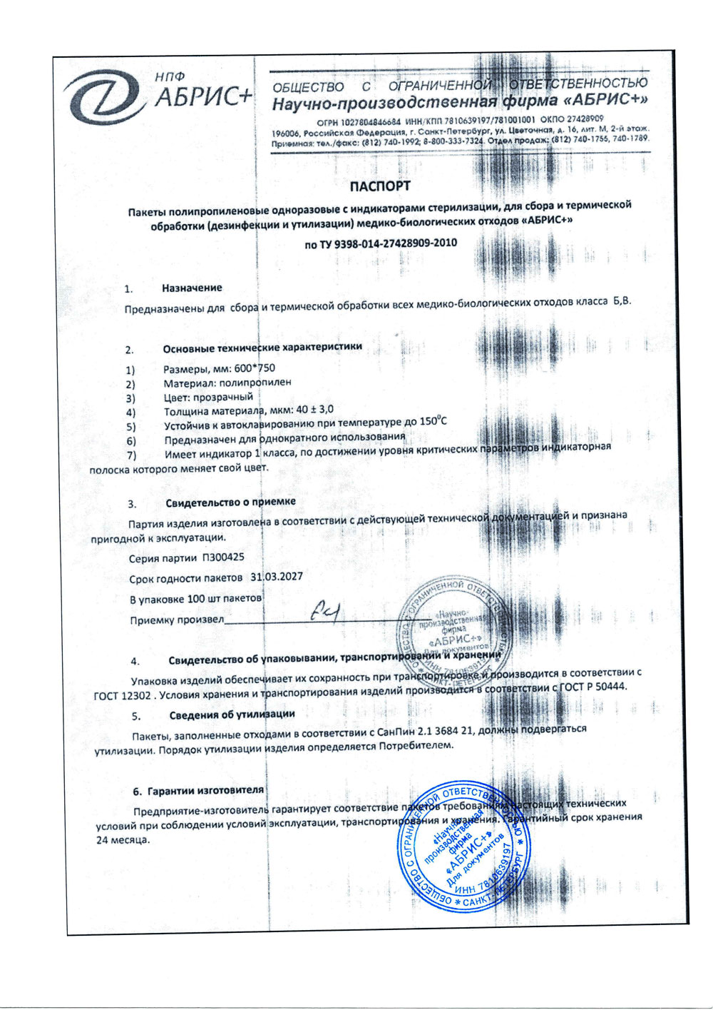 - Пакеты 600х750 полипропил. однораз. для отходов Абрис+. п. П300425 до 31.03.2027