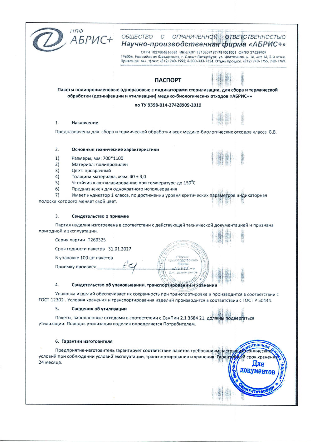 - Пакеты 700х1100 полипропил. однораз. для отходов Абрис+. п. П260325 до 31.01.202