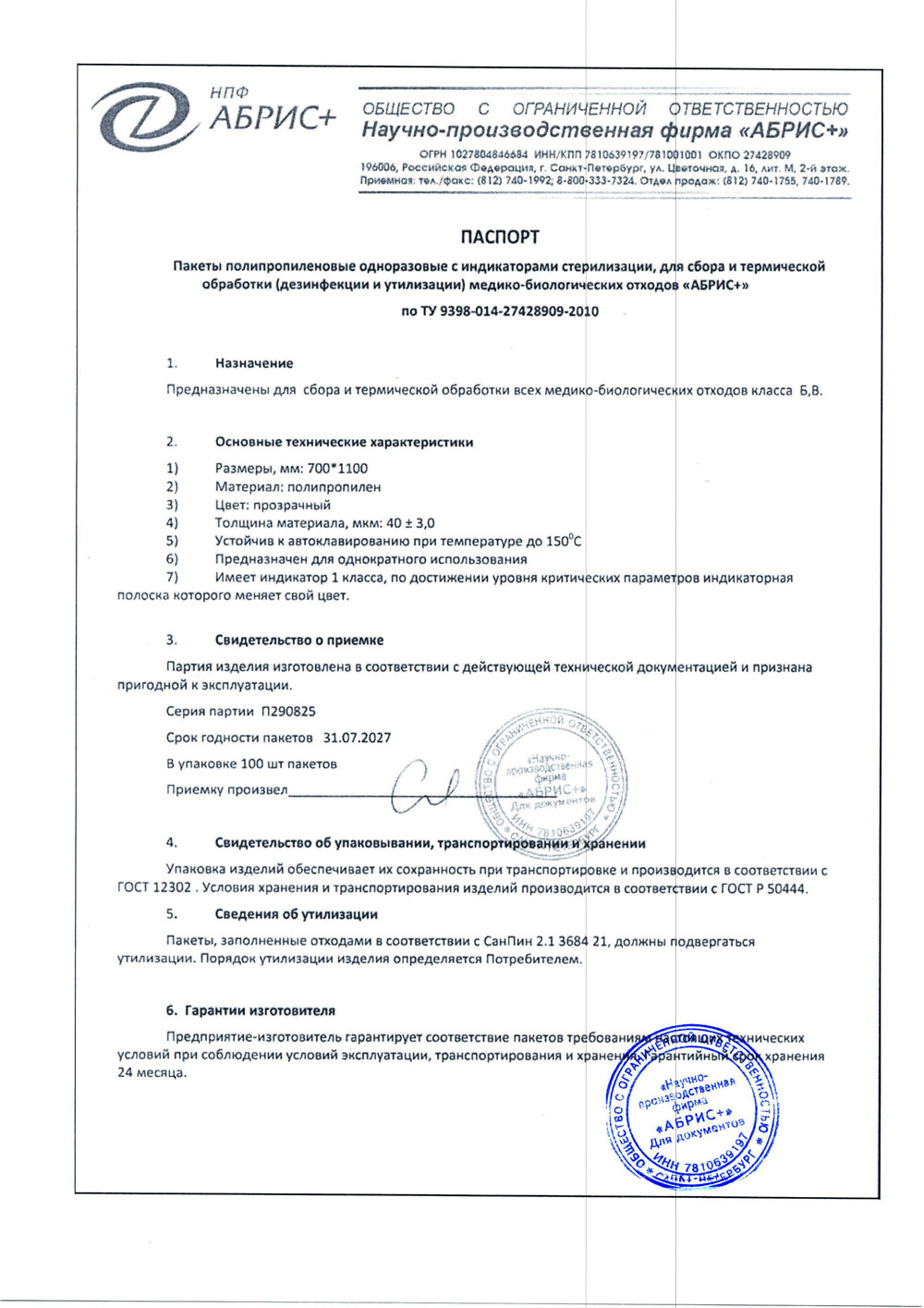- Пакеты 700х1100 полипропил. однораз. для отходов Абрис+. п. П290825 до 31.07.202