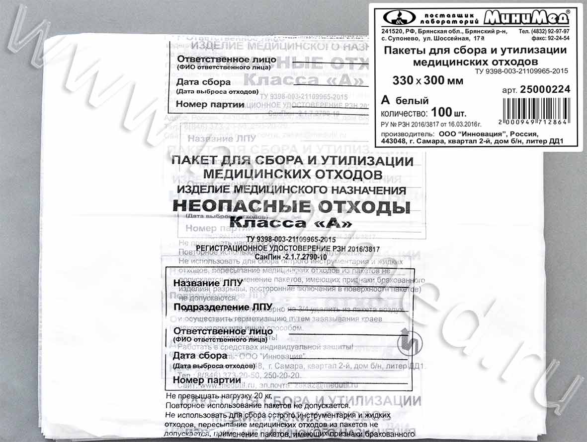 Пакет полиэтиленовый для сбора и утилизации медицинских отходов класса А, белый, 330*300мм, с информацией, уп.100шт.