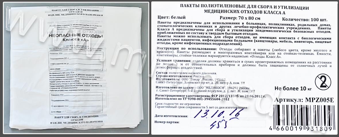 Пакет полиэтиленовый для сбора и утилизации мед. отходов класса А, белый, 700*800мм, с информацией, уп.100шт.