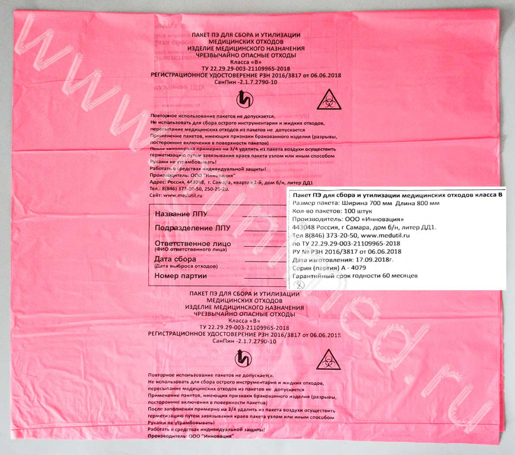 Предназначен для сбора особо опасных отходов: материалов, контактирующих с особо опасными инфекциями, отходов из лабораторий, работающих с микроорганизмами 1-4 групп патогенности, микологических больниц и т.д. На пакете имеется информационное окно для обозначения учреждения, подразделения, даты и фамилии ответственного за сбор отходов лица (поверхность пакета позволяет производить заполнение информационного окна шариковой ручкой). На изделии нанесена ссылка на ТУ, краткая информация о производителе с адресом, контактными телефонами.