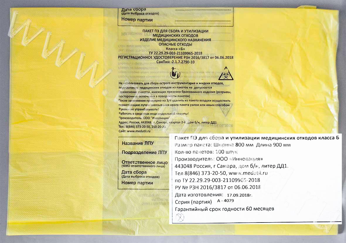 Пакет полиэтиленовый для сбора и утилизации медицинских отходов класса Б, желтый, 800*900мм, с информацией, уп.100шт.