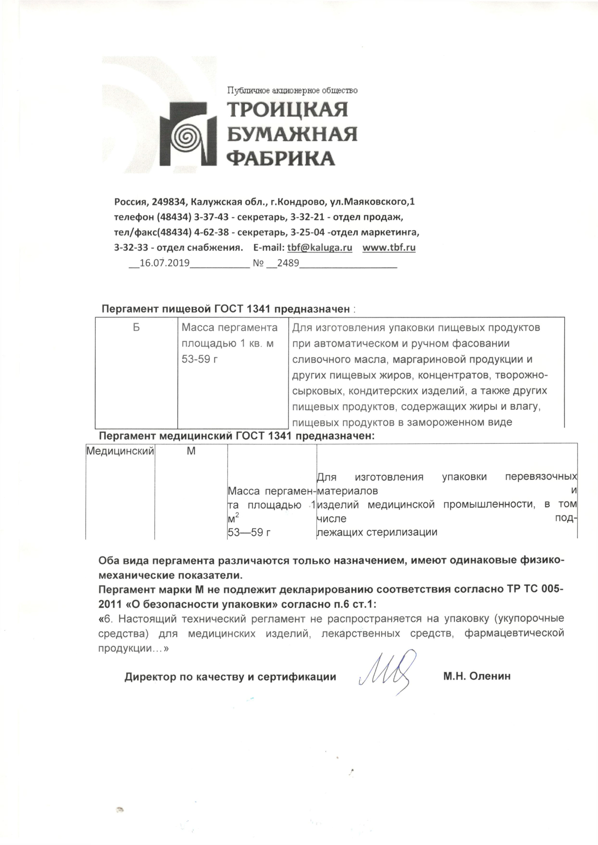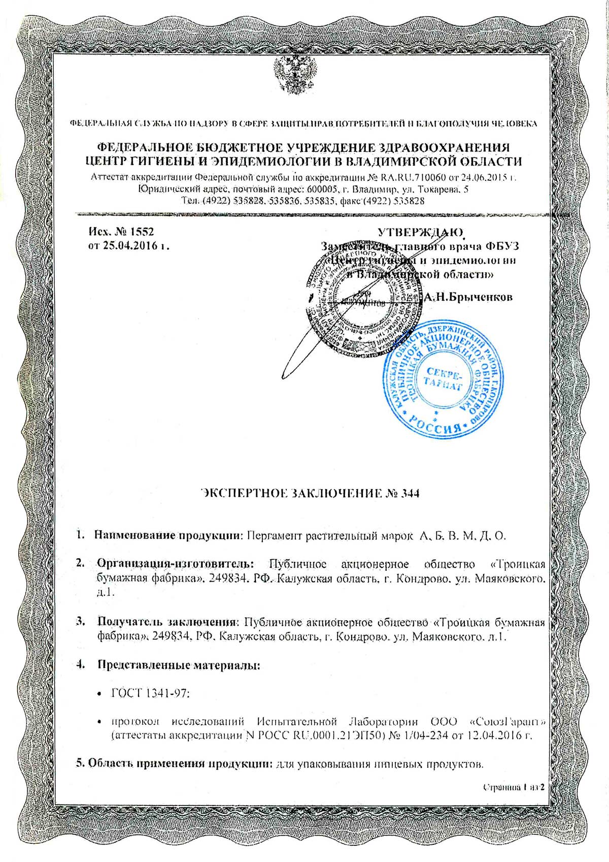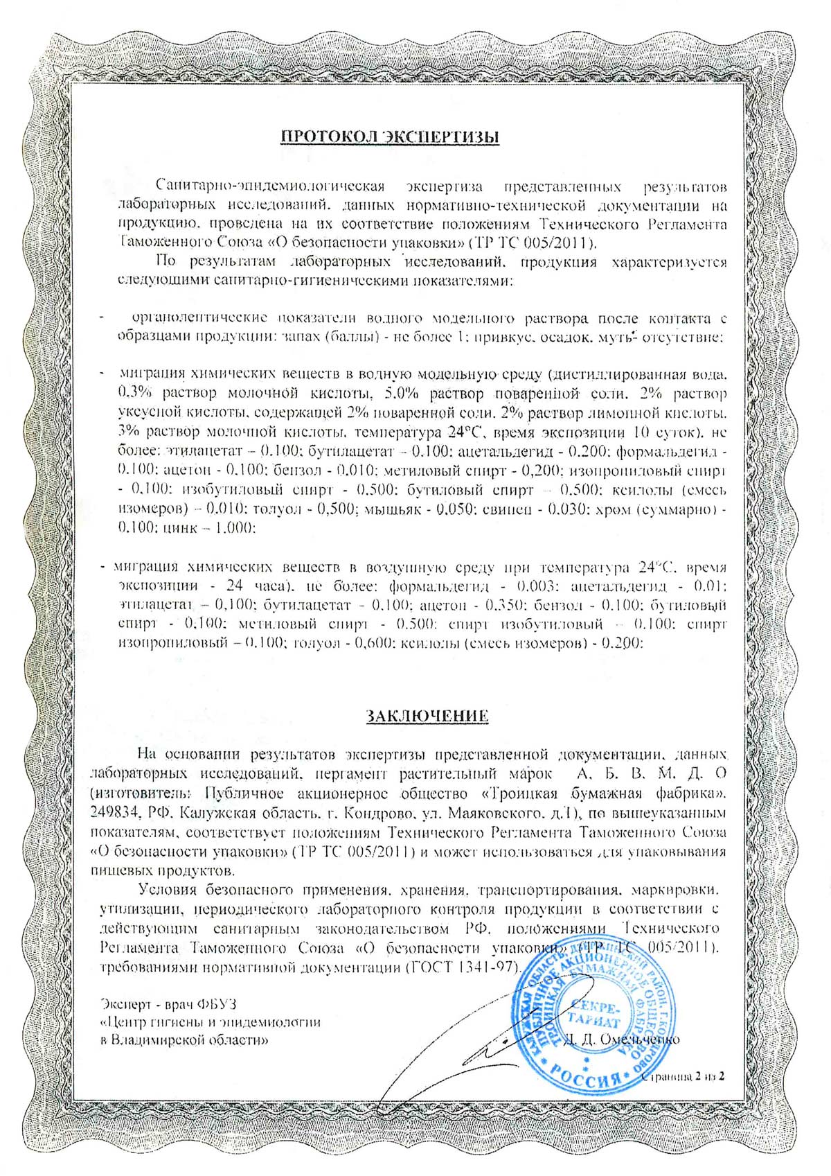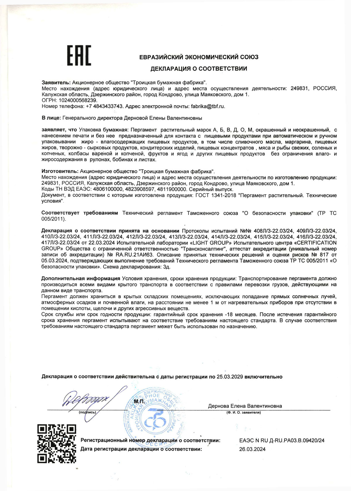 - Пергамент растительный. АО Троицкая бумажная фабрика. Декларация до 26.03.2029