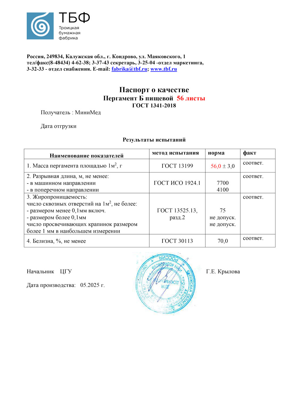 - Пергамент листовой, марка Б, пищевой. Паспорт от 05.2025
