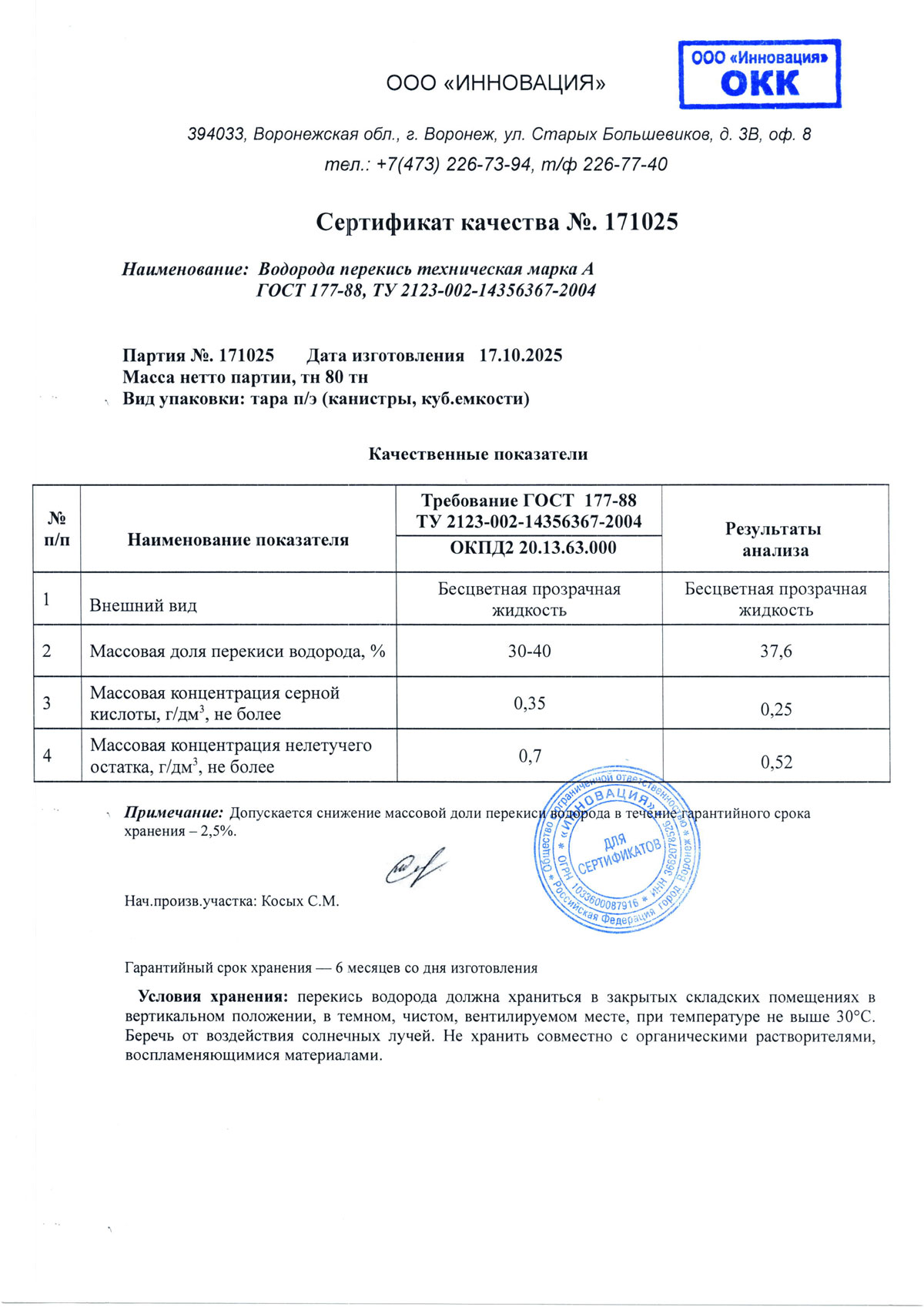 - Перекись водорода тех. марки А. Инновация. Сертификат до 18.06.2027