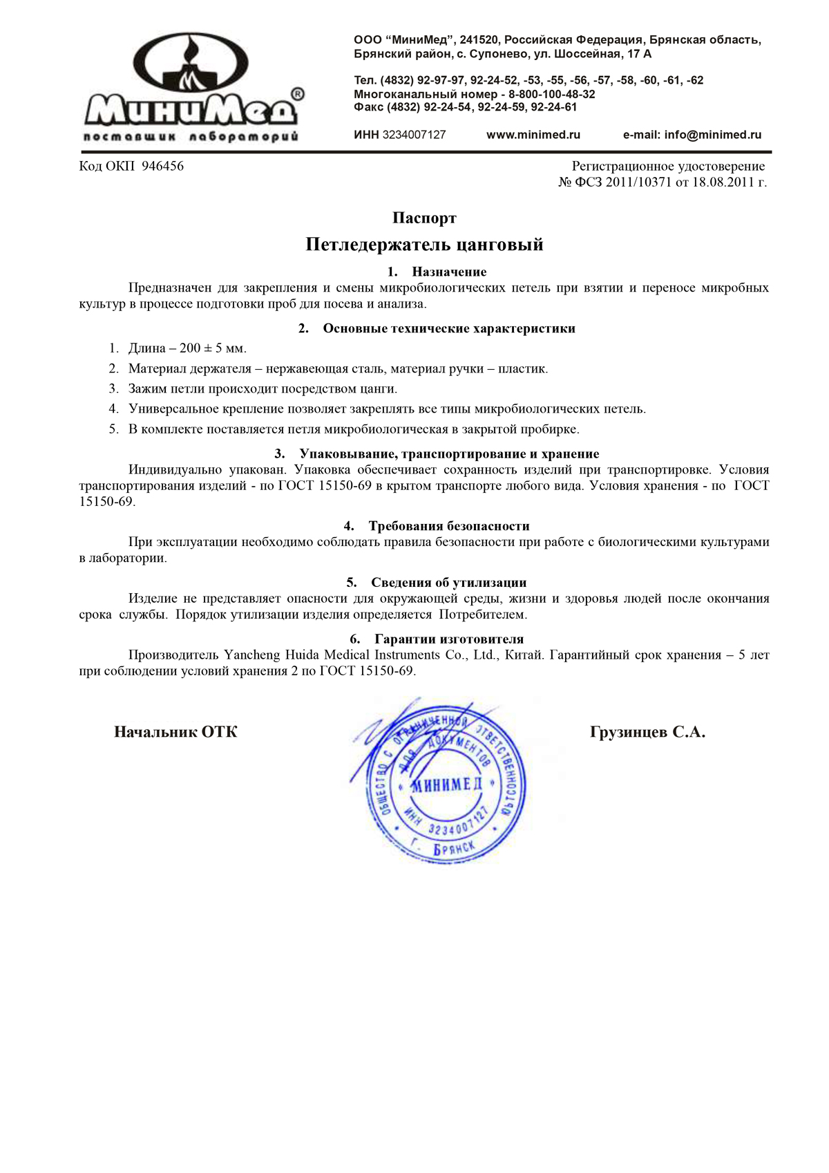 Изготовлен из нержавеющей стали, рукоятка - из пластика.Предназначен для закрепления и смены петель микробиологических, толщиной до 1 мм. Зажим петли происходит посредством цанги.