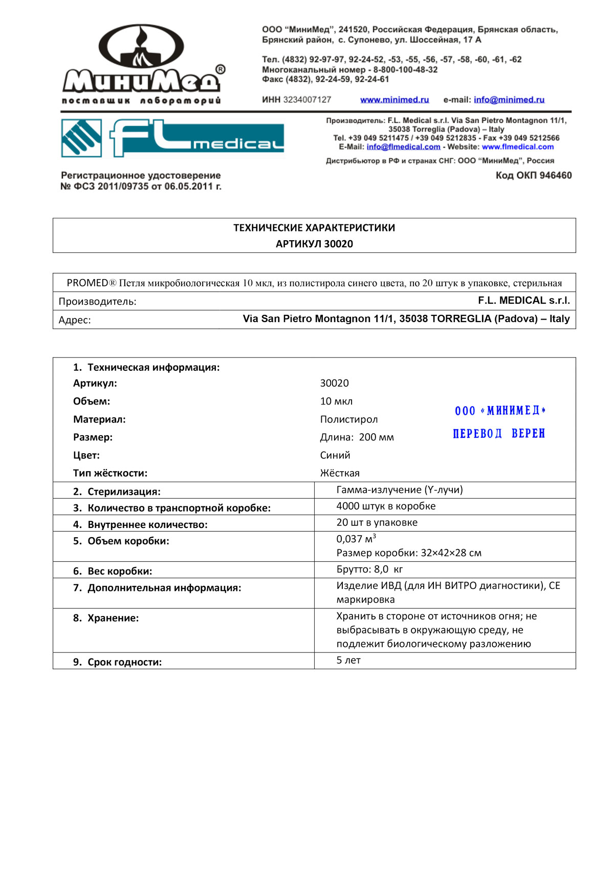 Петли микробиологические 10 мкл,стер.,п/с,жесткая,уп.20 шт./кор.3000 шт., FL medical