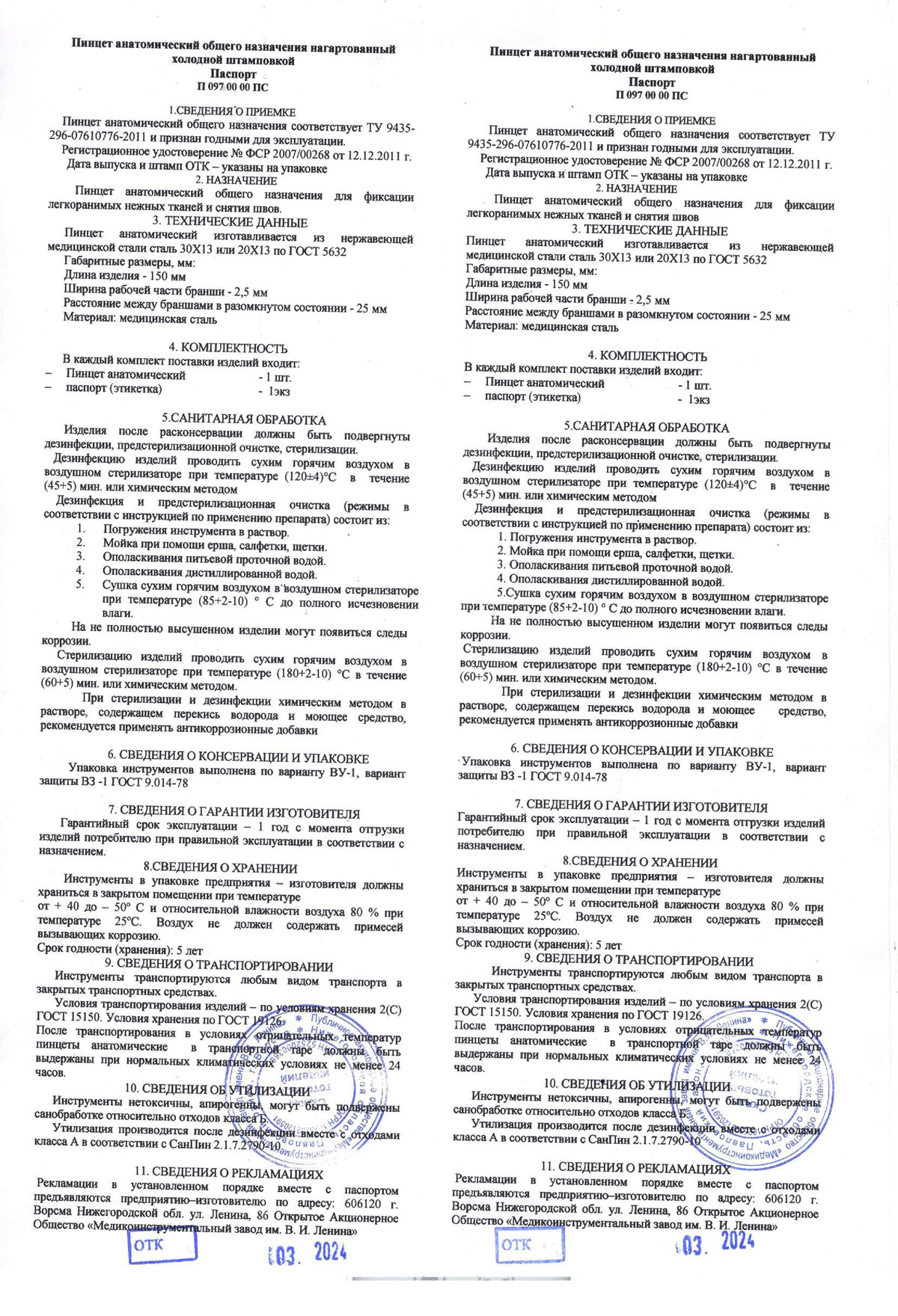 - Пинцет анатомический общего назначения 150х2,5 ПАи-МИЗ-В. Паспорт