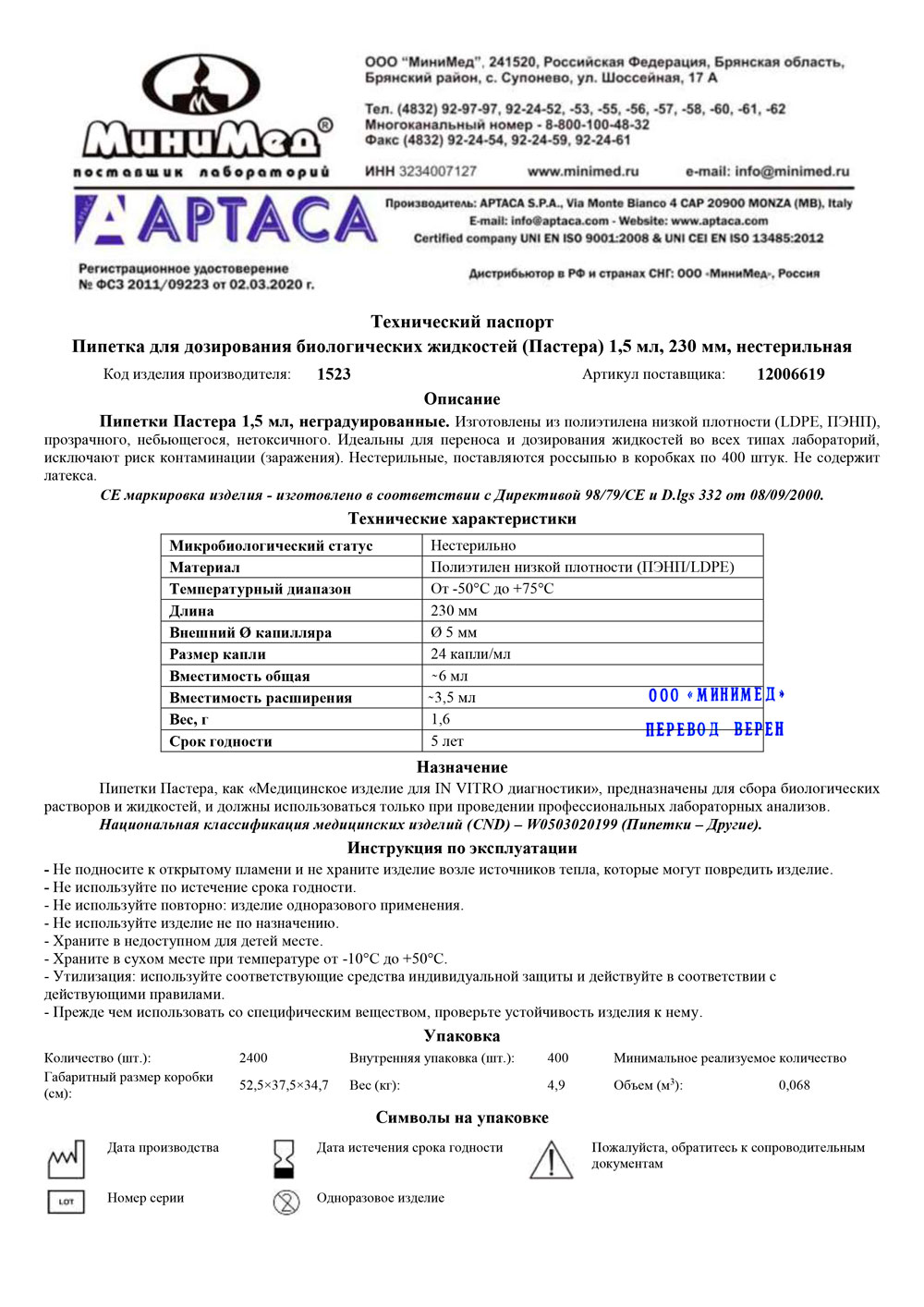 Пипетка для дозирования биологич.жидкостей (Пастера) 1,5 мл,230 мм,п/эт,н/стер, уп. 400 шт, Aptaca