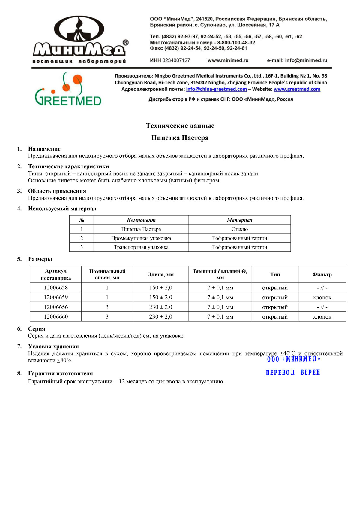 Расчетная вместимость ................................... 3 мл