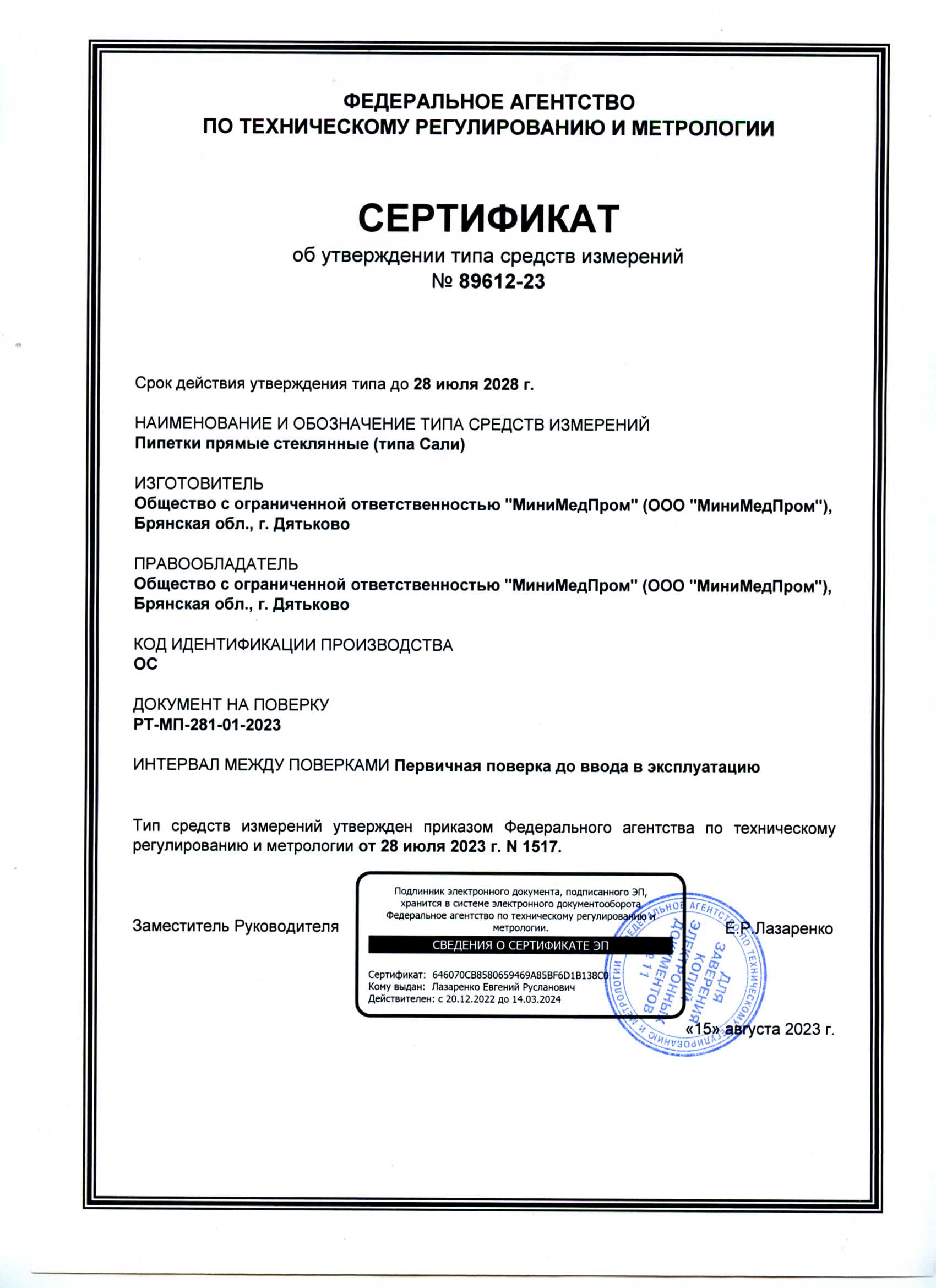 - Пипетки прямые стеклянные (типа Сали). ММП. Сертификат об утверждении ТСИ до 28.