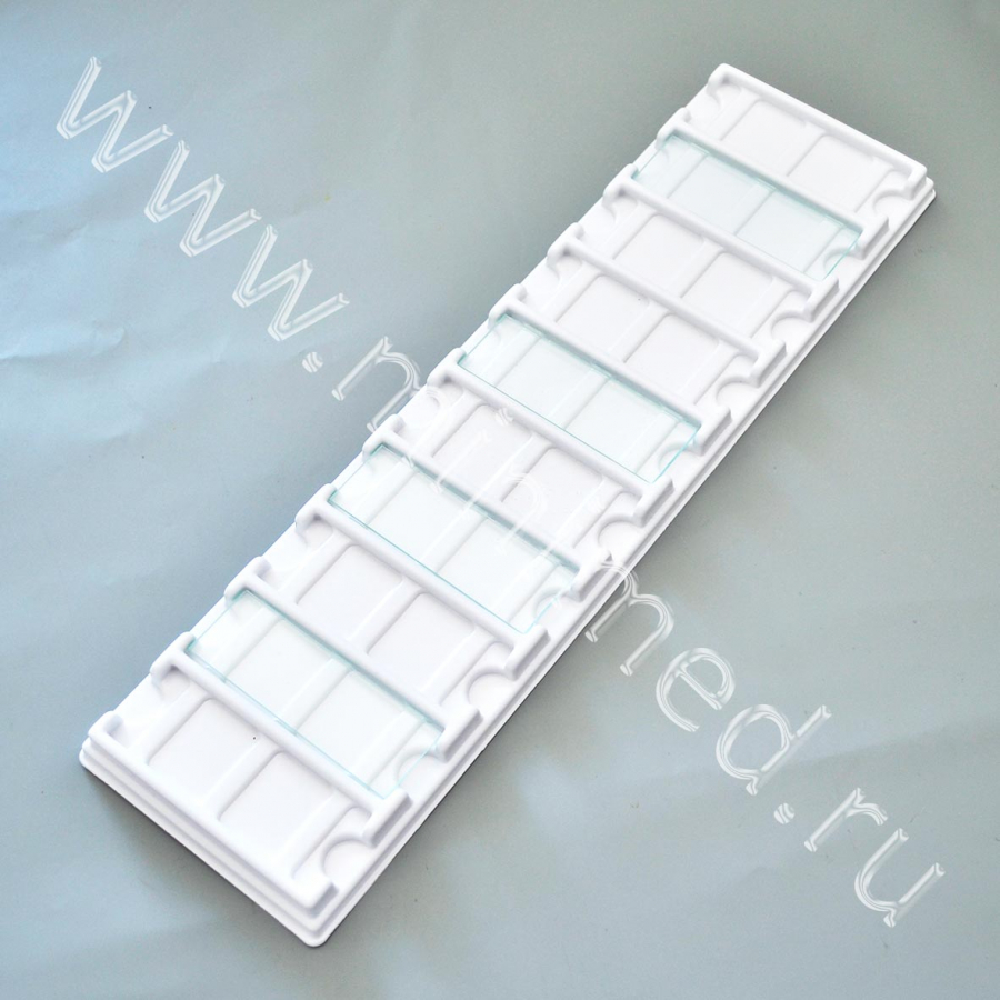 Предназначен для высушивания, хранения и транспортировки предметных стекол размером 76х26 мм. Изготовлен из полистирола.