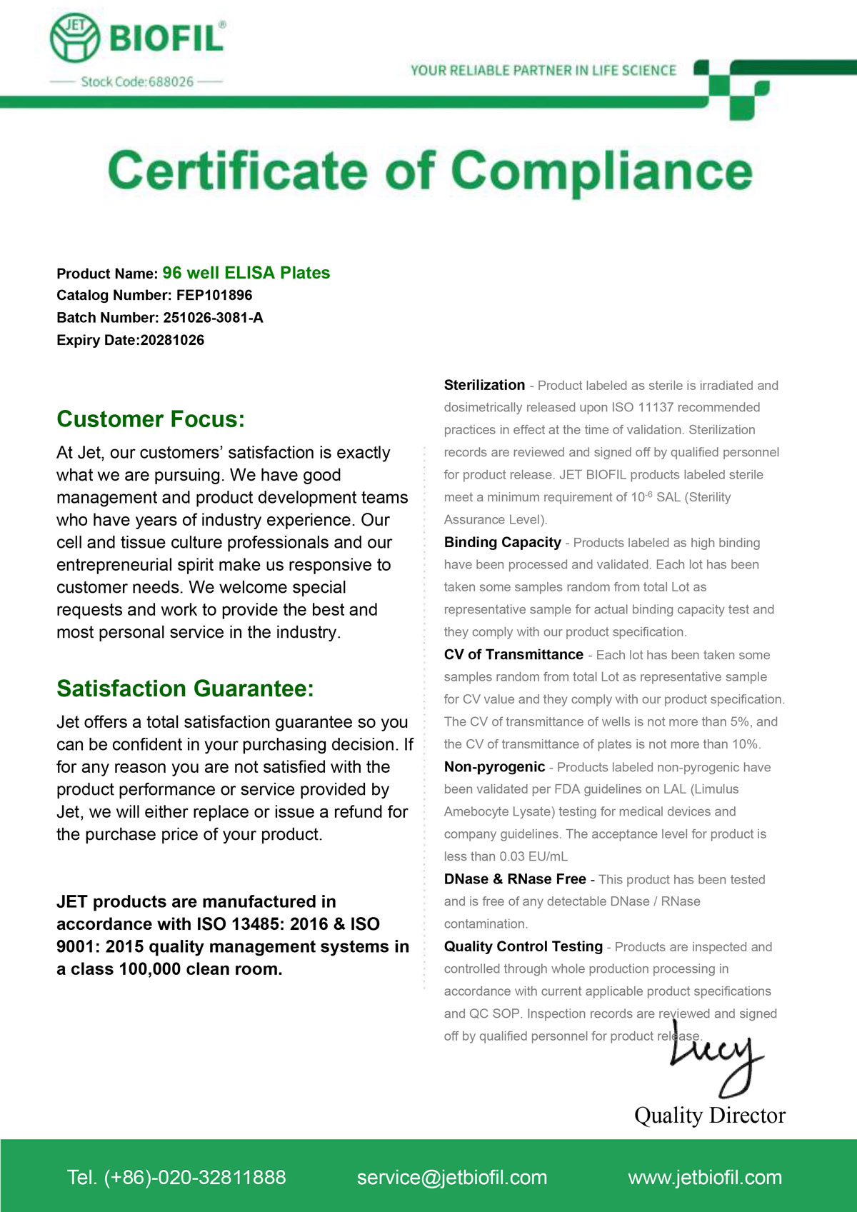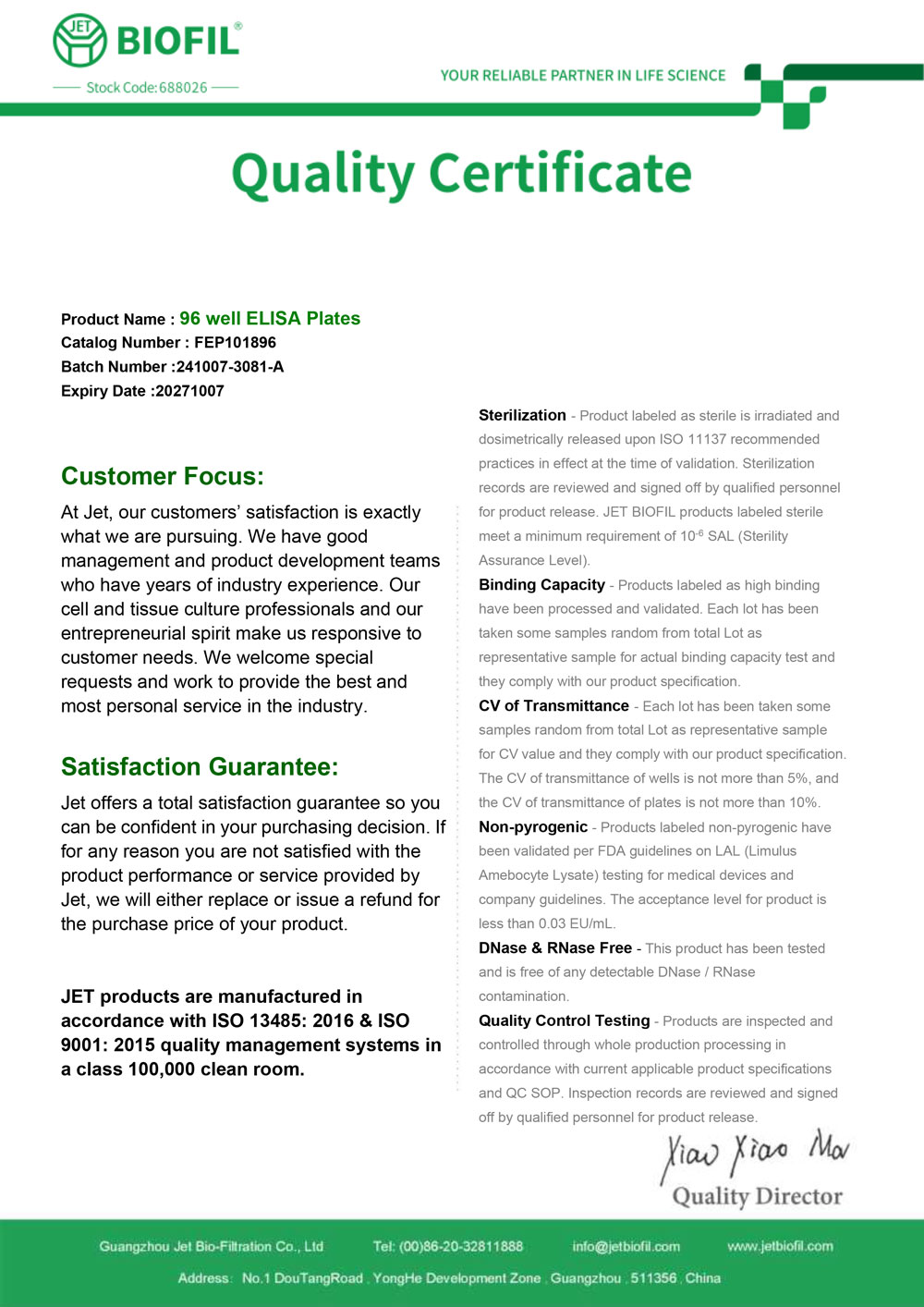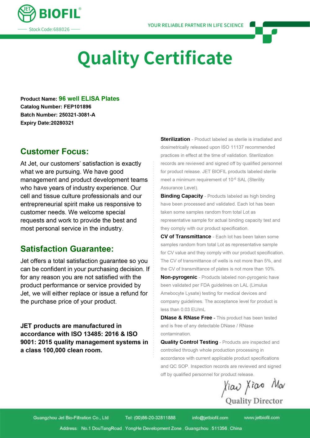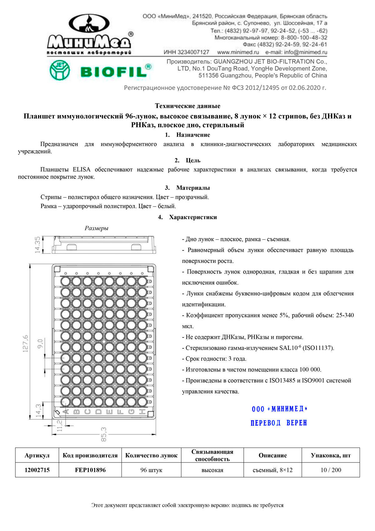 - Сертификат. Планшет иммунол. 96-лунок, 8 лунок х12 стрипов, Jet Bio-Filtration-F
