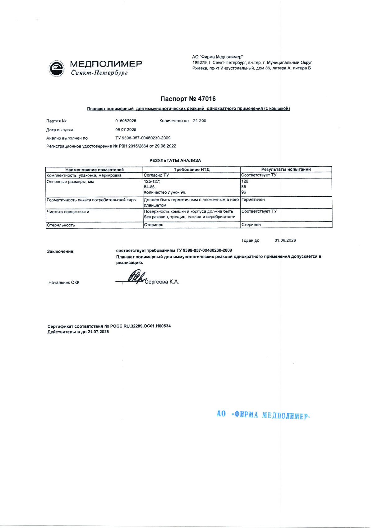 - Планшет полимерный для иммунологических реакций, п. 016062025 до 01.06.2028