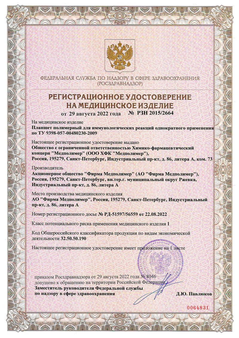 РУ № РЗН 2015/2664 от 29.08.2022 г.