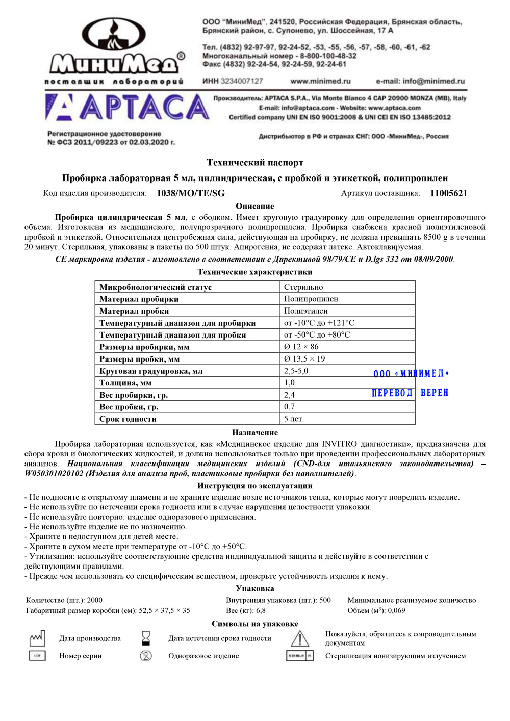 Предназначеня для отбра проб, проведения химических, биологических, микробиологических анализов, в малых объемах химических реакций. Изготовлена из полипропилена. Имеется этикетка для записи, круговая градуировка для определения ориентировочного объема на 2,5-5,0 мл, апирогенна. Стерильная. Относительная центробежная сила, действующая на пробирку, не должна превышать 8500 g.