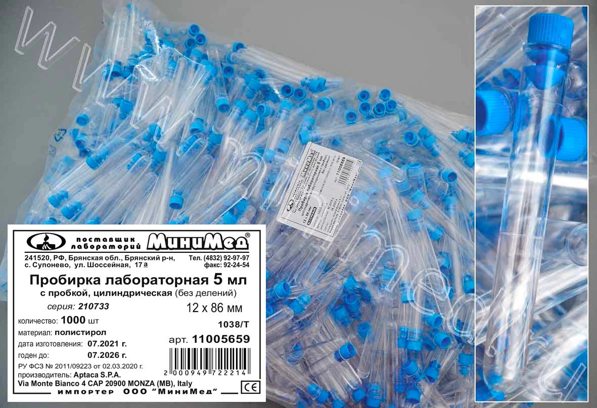 Пробирка лабораторная 5 мл, 12×86 мм, цилиндр.,с пробкой,п/с, уп.500/4000шт., Aptaca