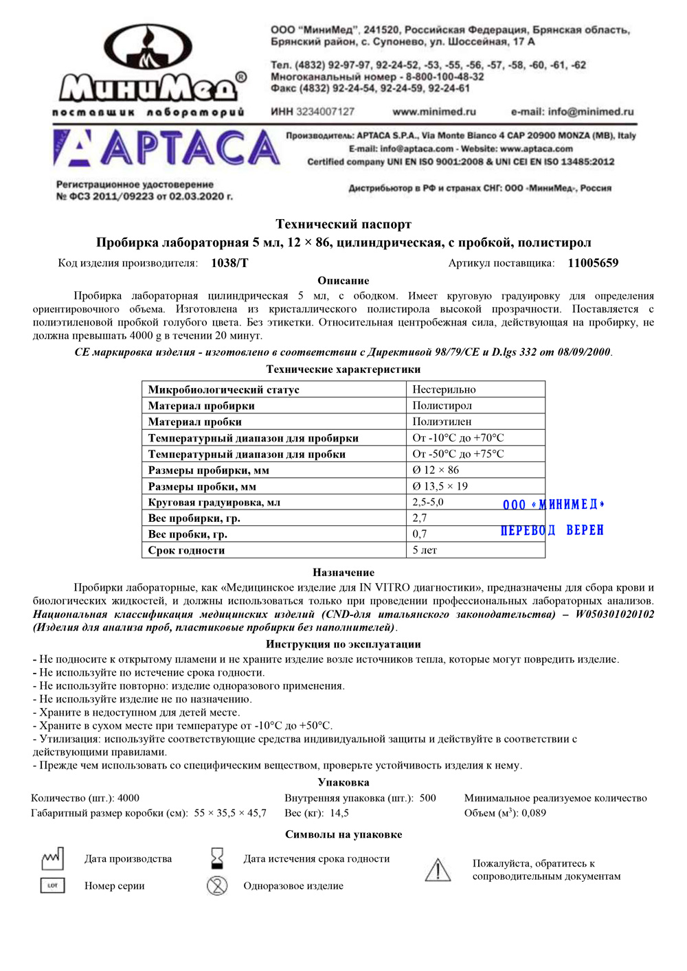 Предназначены для отбора проб, проведения химических, биологических, микробиологических анализов, в малых объемах химических реакций. Изготовлена из полистирола. Градуированная, с ободком. Нестерильная. Укомплектована пробкой синего цвета. Относительная центробежная сила, действующая на пробирку, не должна превышать 4000 g.