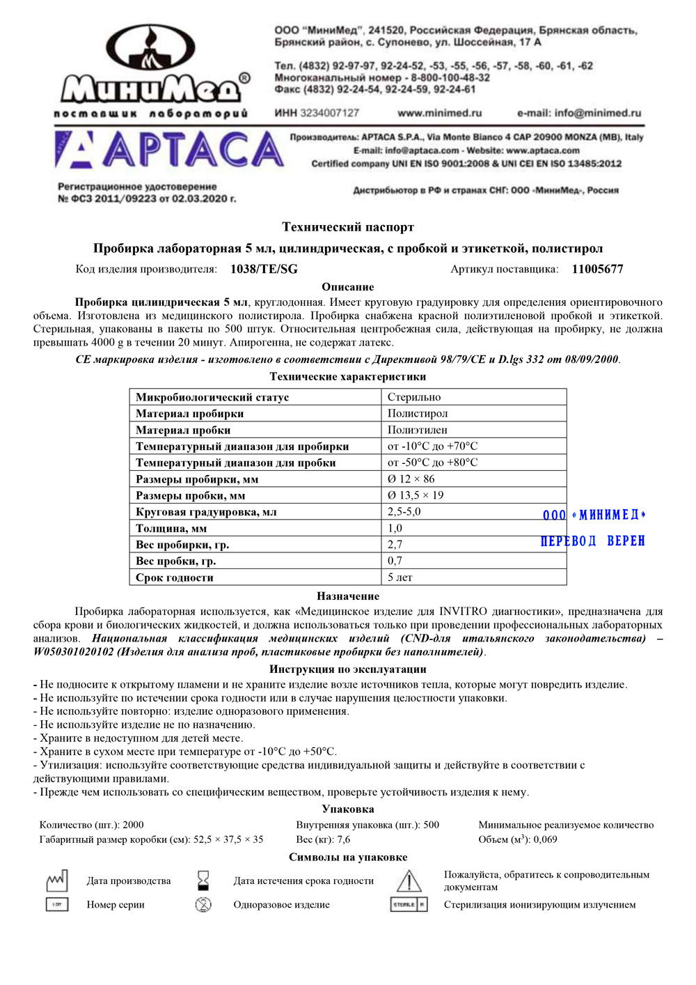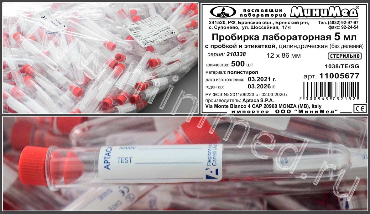 Пробирка лабораторная 5 мл, цилиндрическая,12×86 мм, круглод.,б/дел.,с пробк.и этикеткой,п/с,уп.500 шт., стер., Aptaca