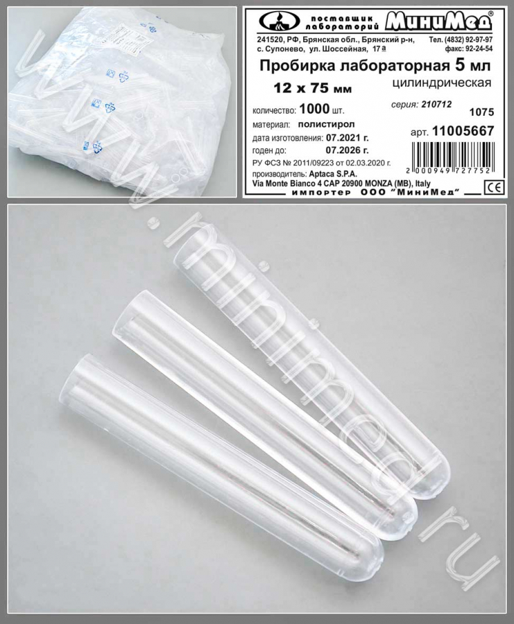 Пробирка лабораторная 5 мл, цилиндрическая,12*75,п/с, уп. 1000/5000 шт, Aptaca