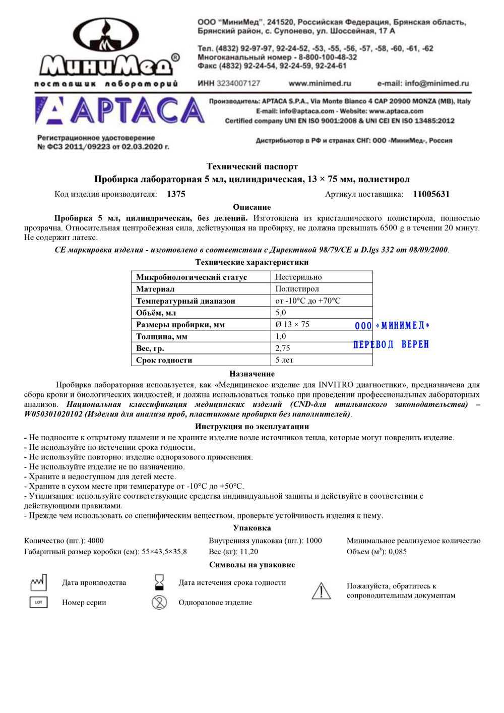 Пробирка лабораторная 5 мл, цилиндрическая,13×75 мм, п/с, уп. 1000/4000 шт, Aptaca