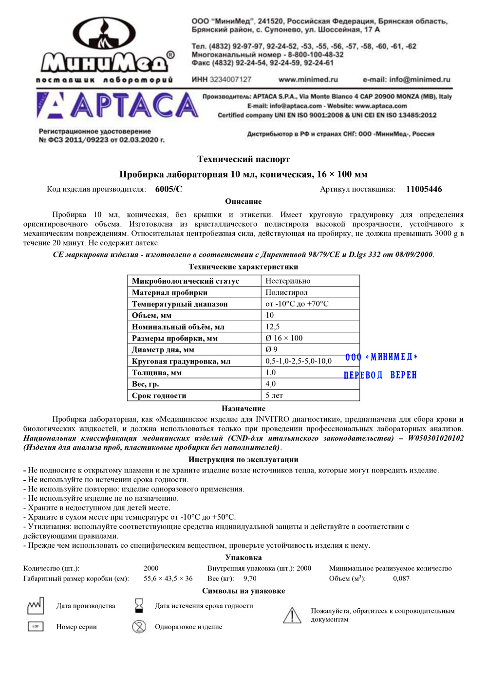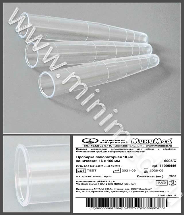 Пробирка предназначена для биологических жидкостей. Изготовлена из полистирола. Имеет круговую градуировку для определения ориентировочного объема (0,5-1,0-2,5-5,0-10,0 мл).