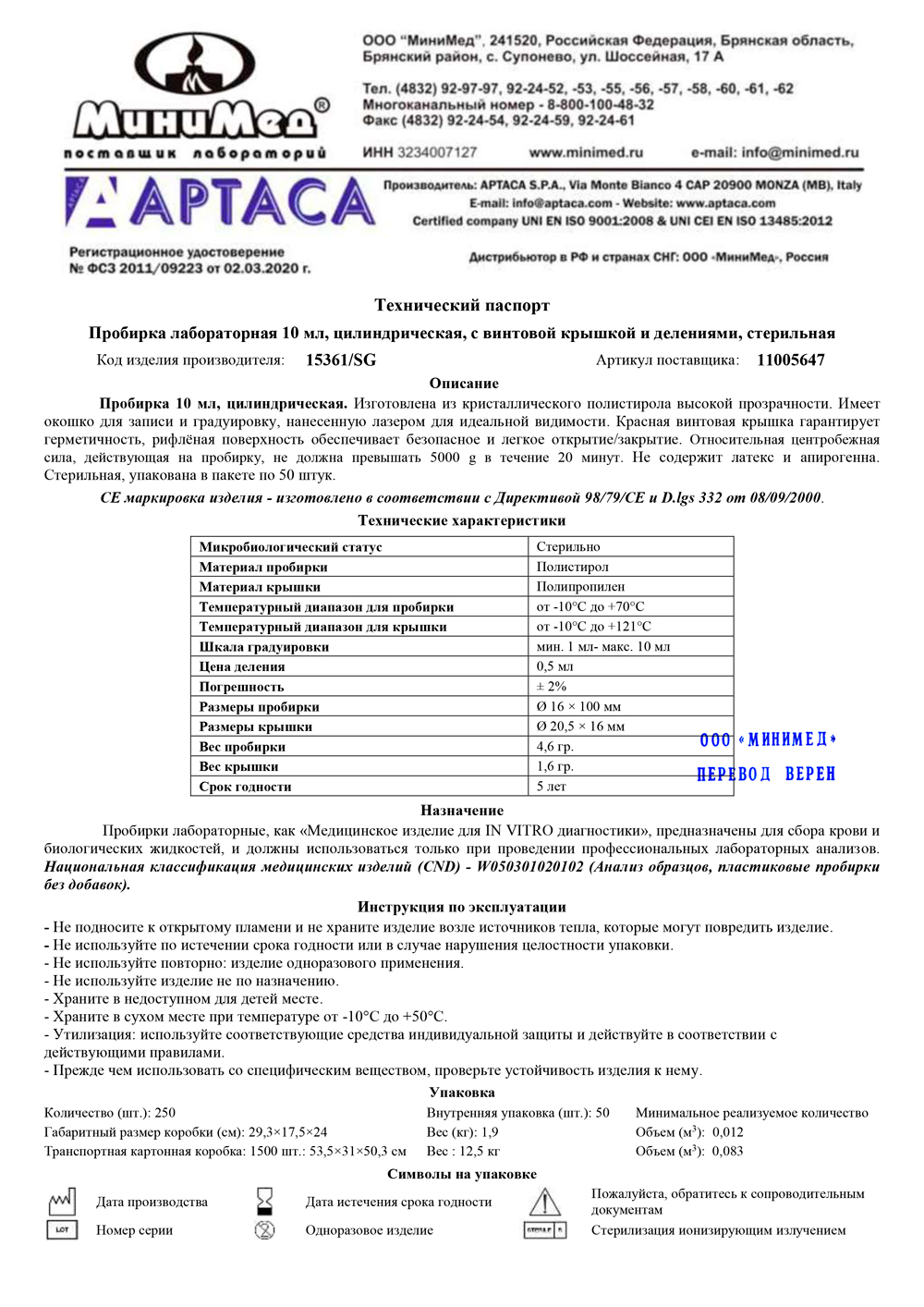 Предназначеня для отбра проб, проведения химических, биологических, микробиологических анализов, в малых объемах химических реакций. Изготовлена из прозрачного полистирола, герметично укупоривается красной полипропиленовой винтовой крышкой, имеется окно для записи информации, нанесена четкая градуировка. Стерильная. Апирогенна. Относительная центробежная сила, действующая на пробирку, не должна превышать 5000 g.