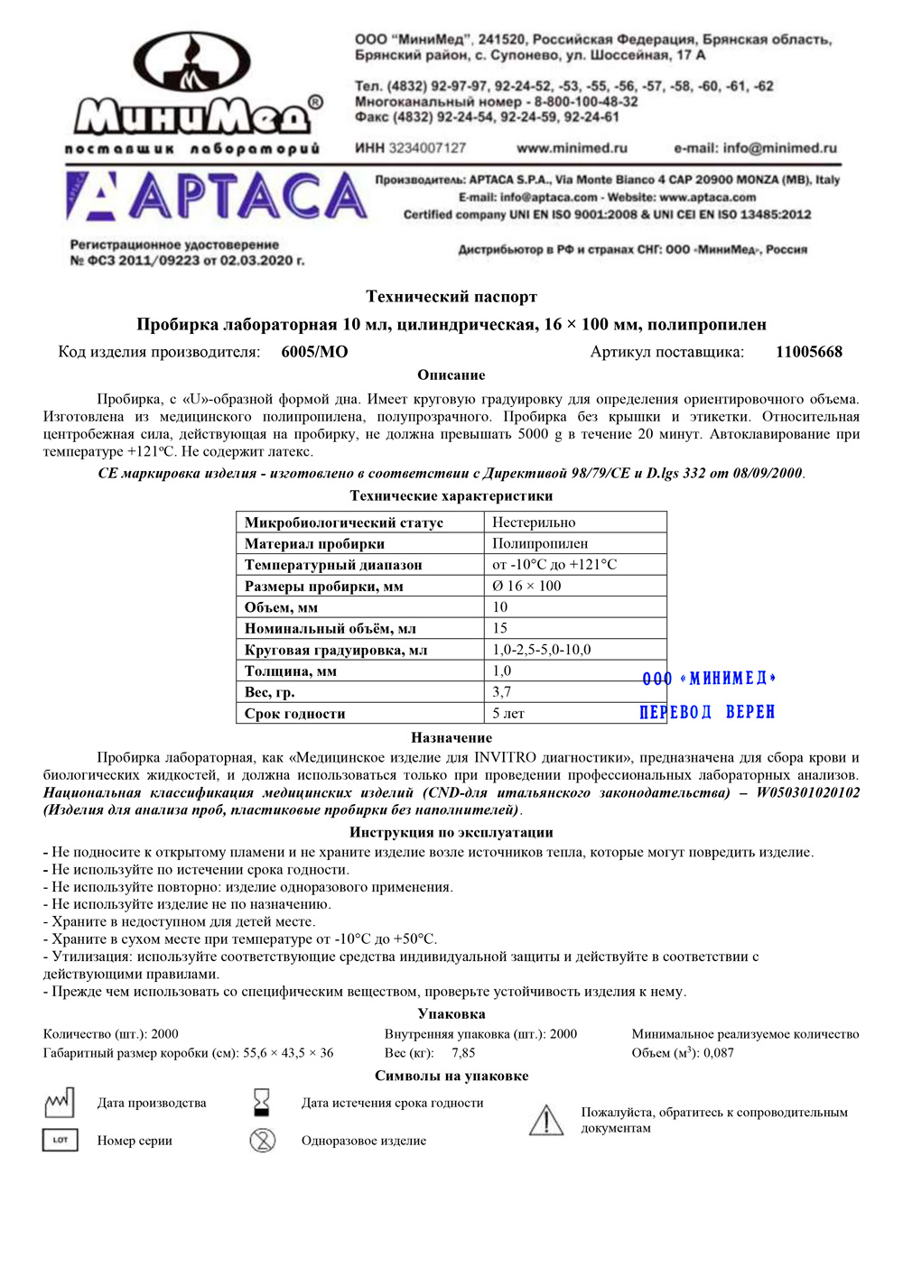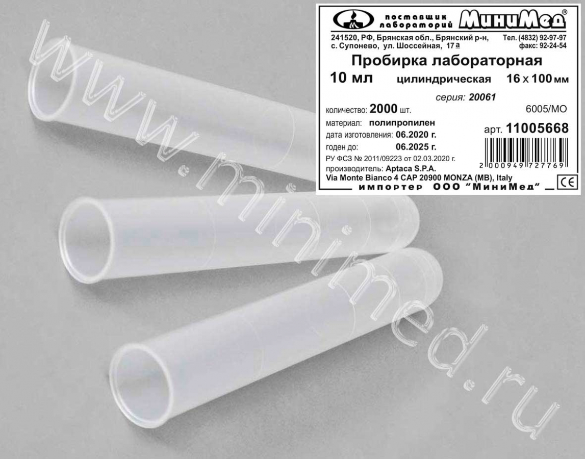 Пробирка лабораторная 10 мл, цилиндрическая,16*100,п/п, уп.2000 шт, Aptaca