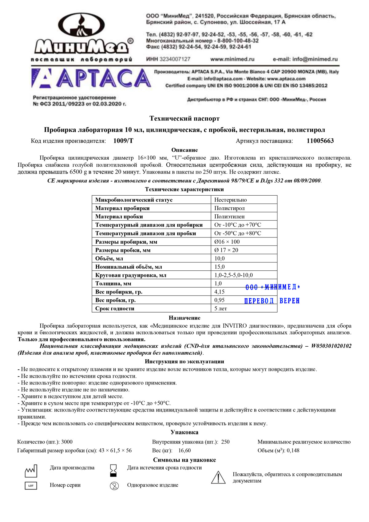 Пробирка предназначена для центрифугирования биологических и иных жидкостей. Изготовлена из полистирола. Снабжена голубой пробкой. Имеет круговую градуировку для определения ориентировочного объема на 1,0-2,5-5,0-10,0 мл. Нестерильная. Относительная центробежная сила, действующая на пробирку, не должна превышать 6500 g.