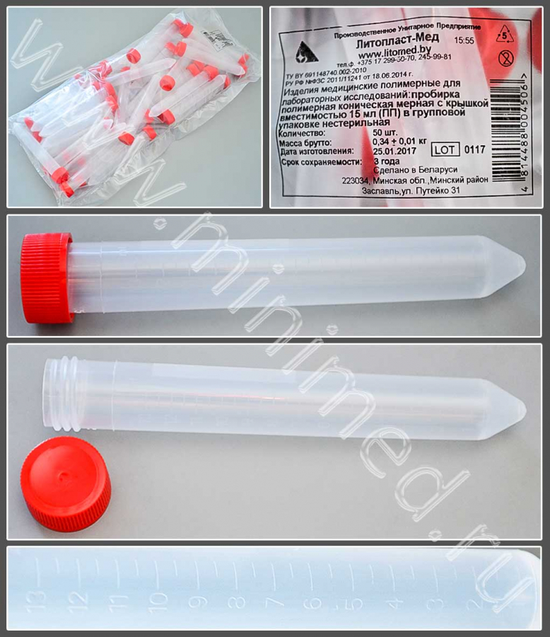 Пробирка полимерная коническая мерная с крышкой вместимостью 15 мл , п/п, в групповой упаковке нестерильная, уп.50шт/кор.300шт, Литопласт