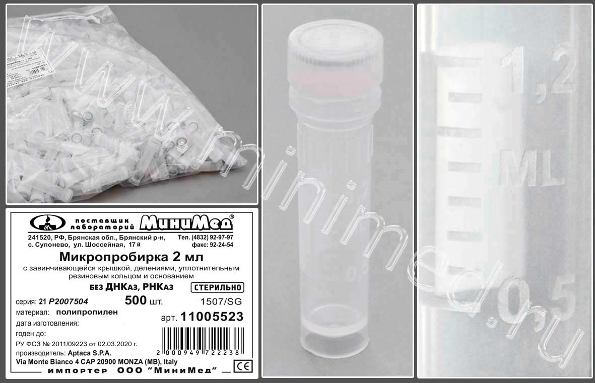 Микропробирка 2 мл, п/п с завинч.кр.,стер.,с уплотн.резиновым кольцом,с основанием,б/ДНК-аз,РНК-аз,уп.500/1000шт., Aptaca