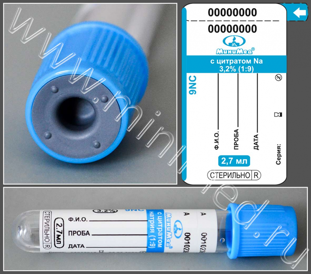 Пробирка вакуумная МиниМед с цитратом натрия 3,2%, 2,7 мл,13*75 мм, голубой, ПЭТФ,уп.100 шт,